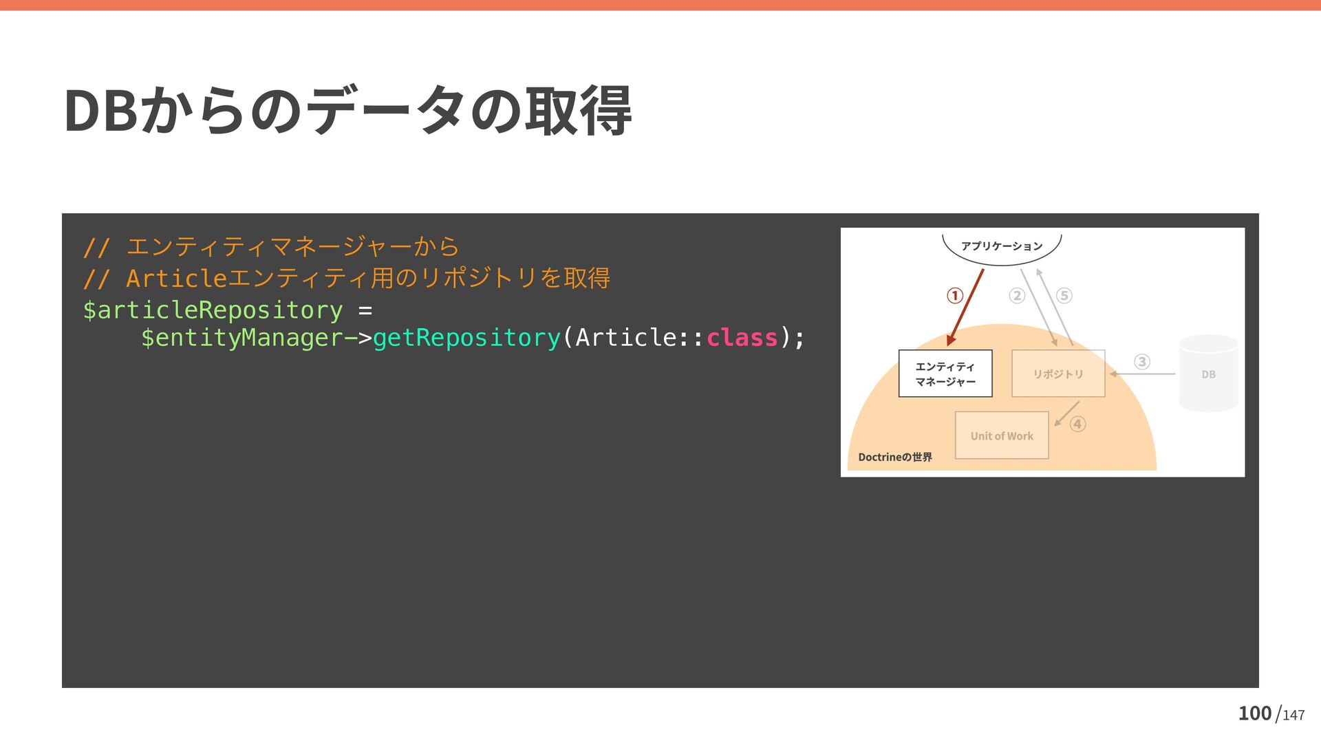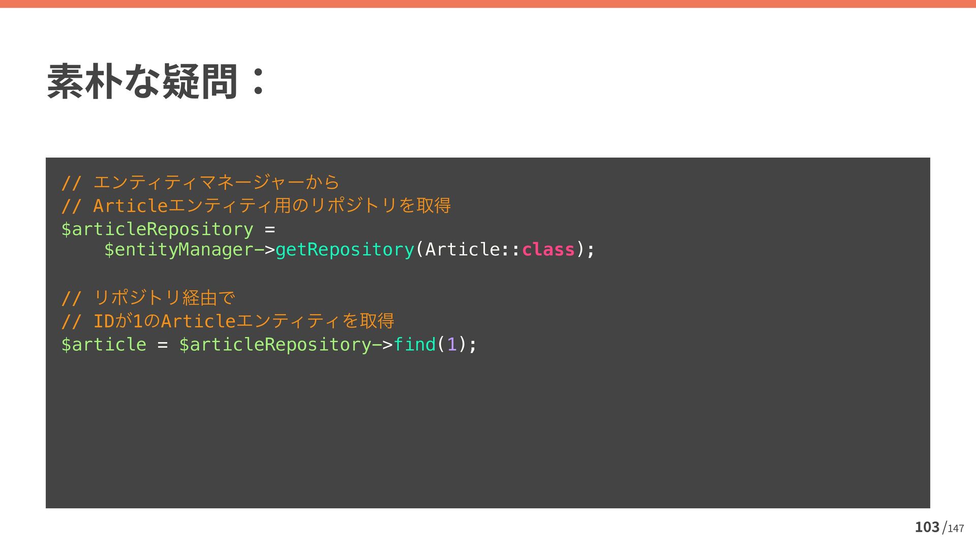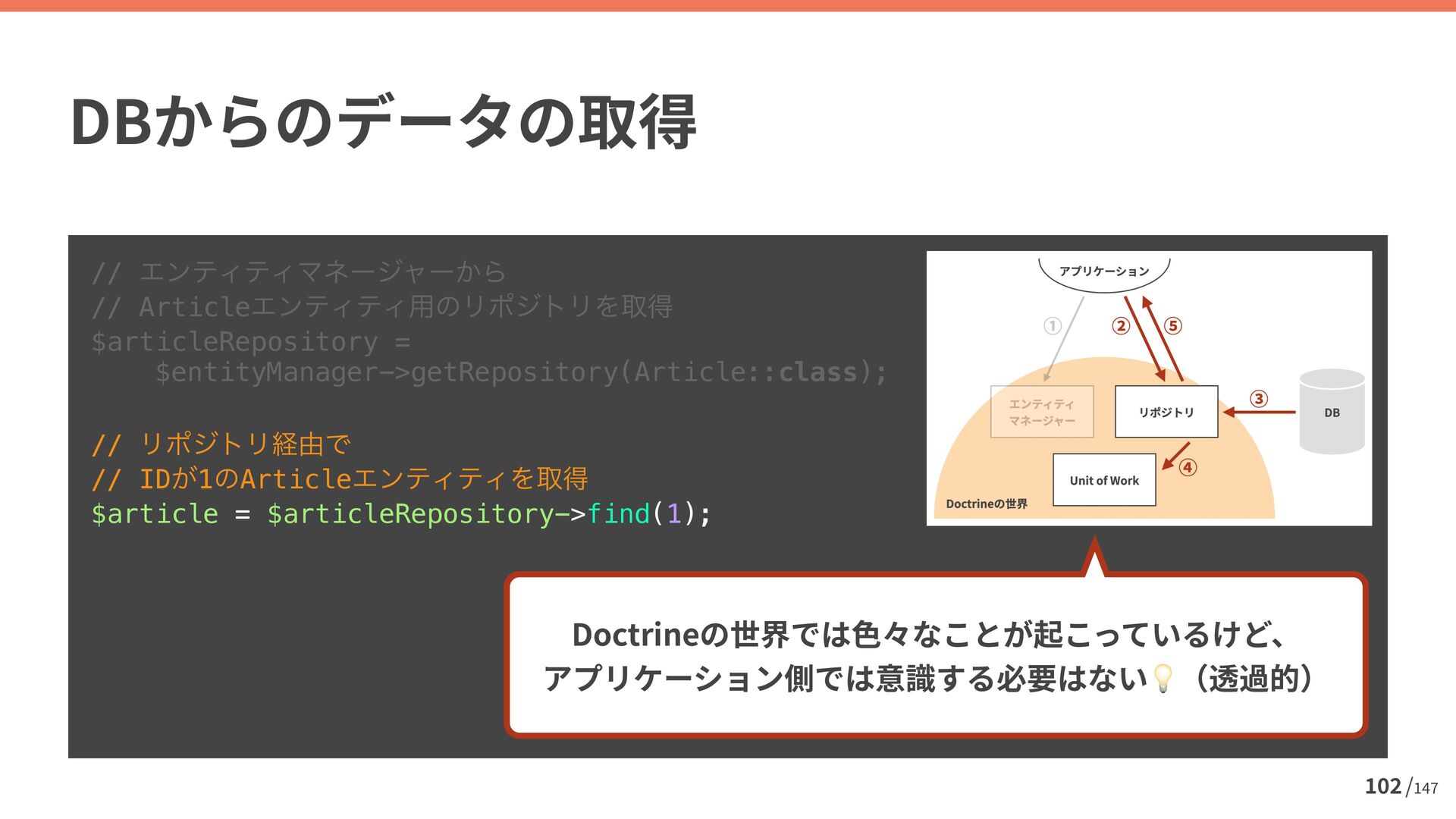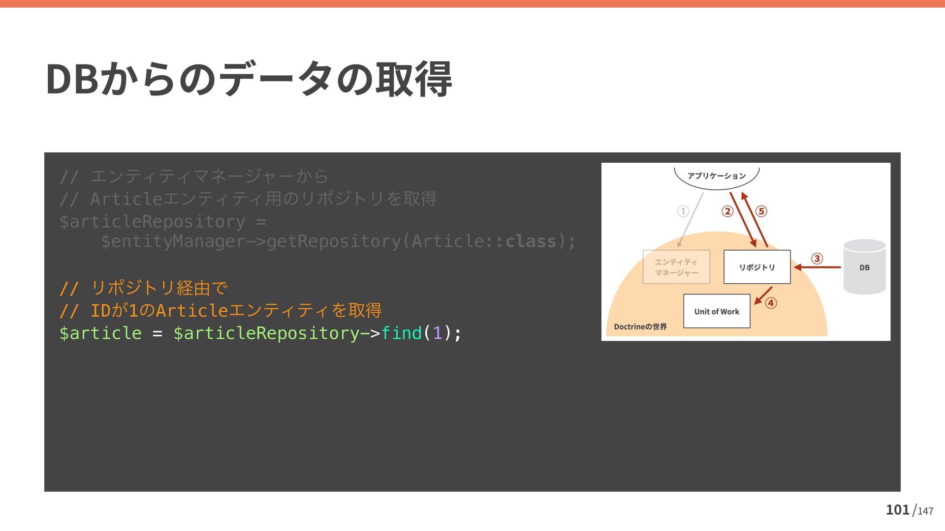 ϦϙδτϦܦ༝Ͱ // ID͕1ͷArticleΤϯςΟςΟΛऔಘ $article = $articleRepository->find(1);  102 DB Doctrine 色 💡