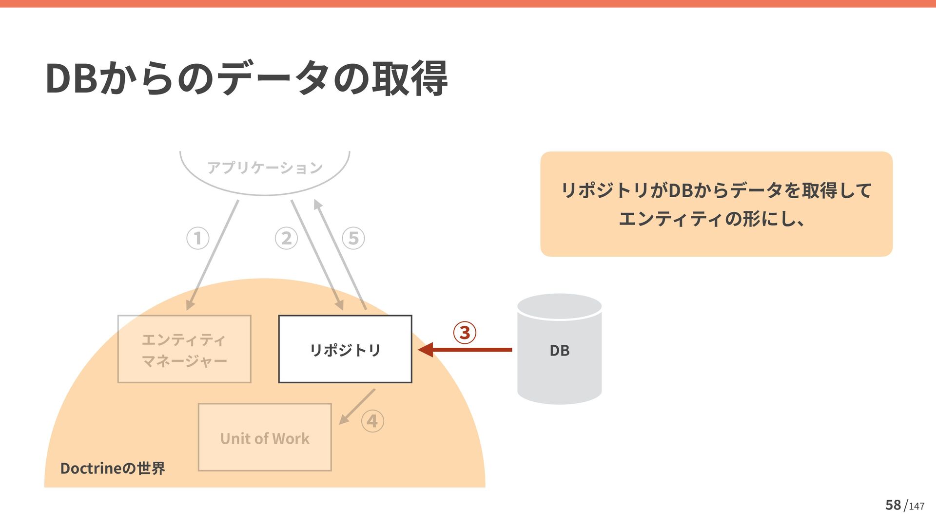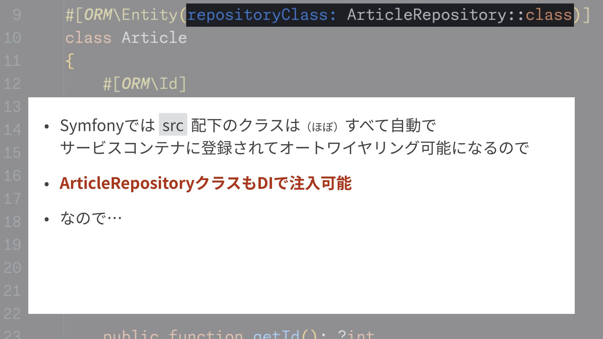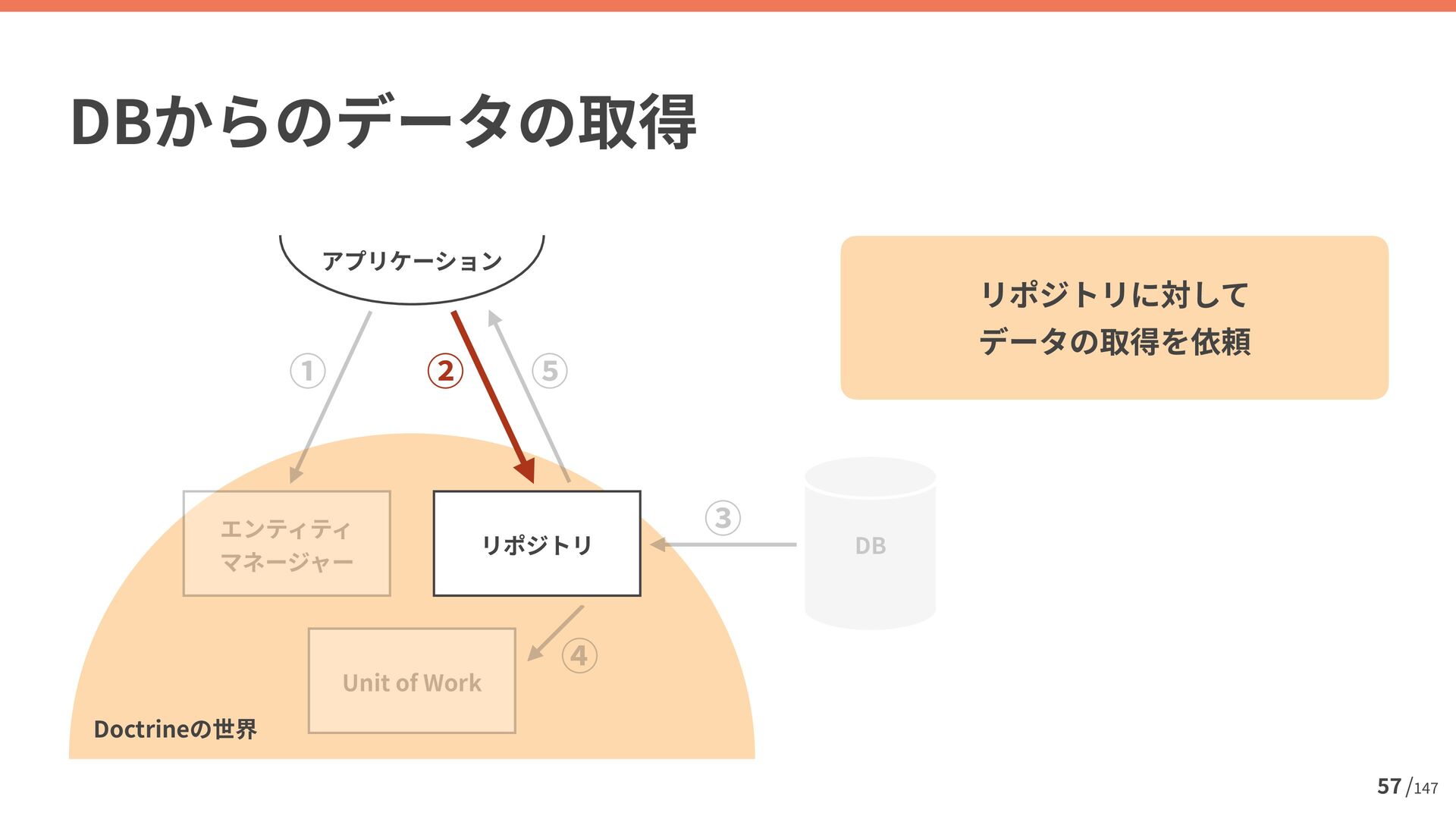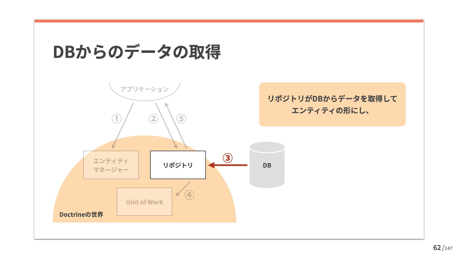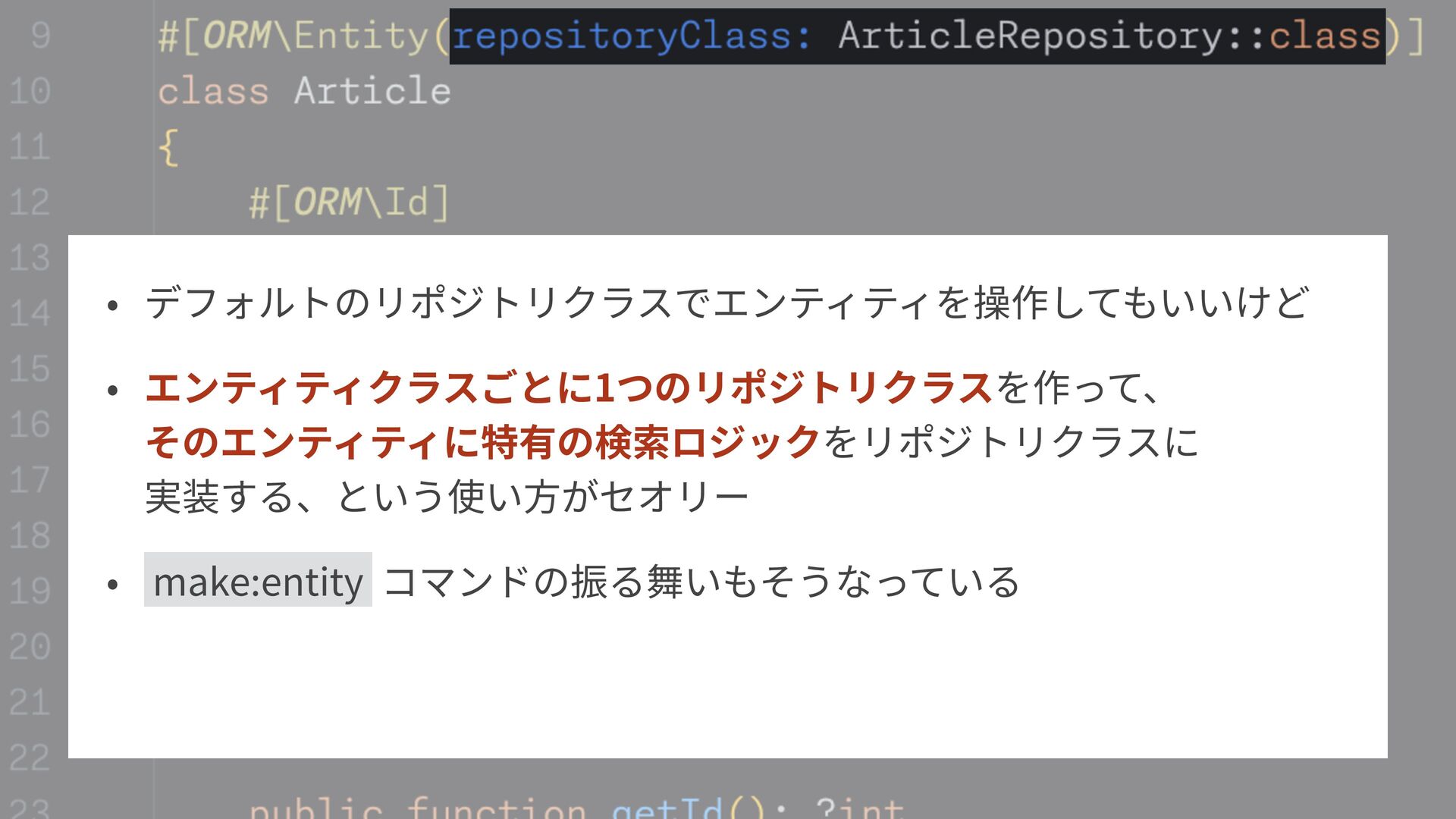 ϦϙδτϦܦ༝Ͱ // ID͕1ͷArticleΤϯςΟςΟΛऔಘ $article = $articleRepository->find(1);  102 DB Doctrine 色 💡