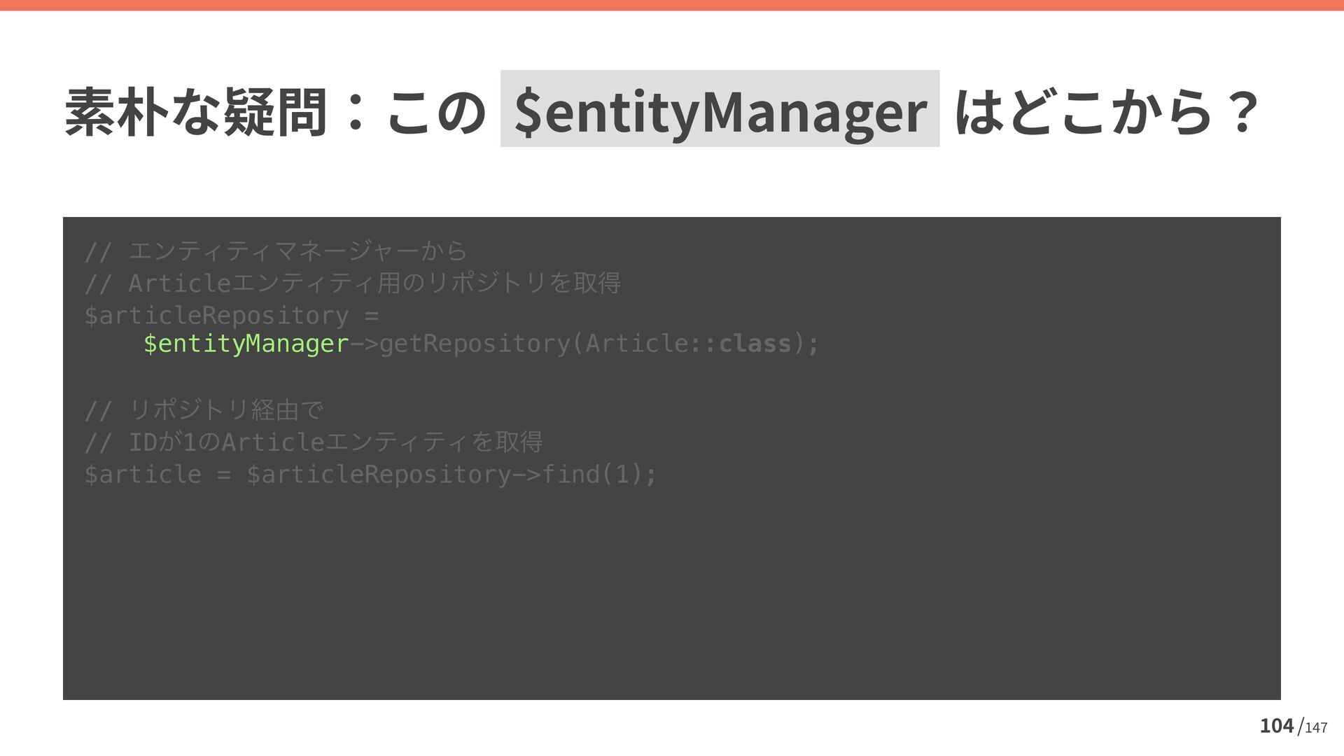ϦϙδτϦܦ༝Ͱ // ID͕1ͷArticleΤϯςΟςΟΛऔಘ $article = $articleRepository->find(1);  103 $entityManager