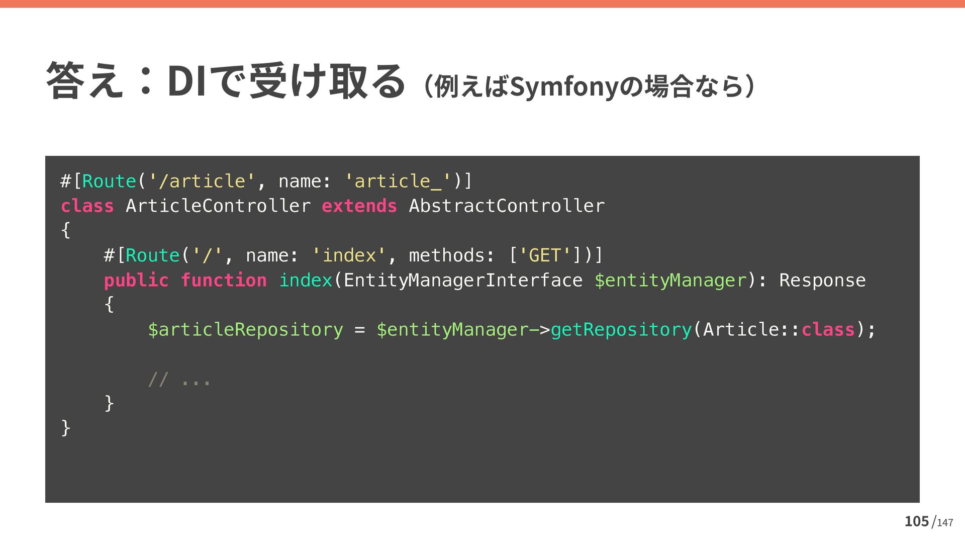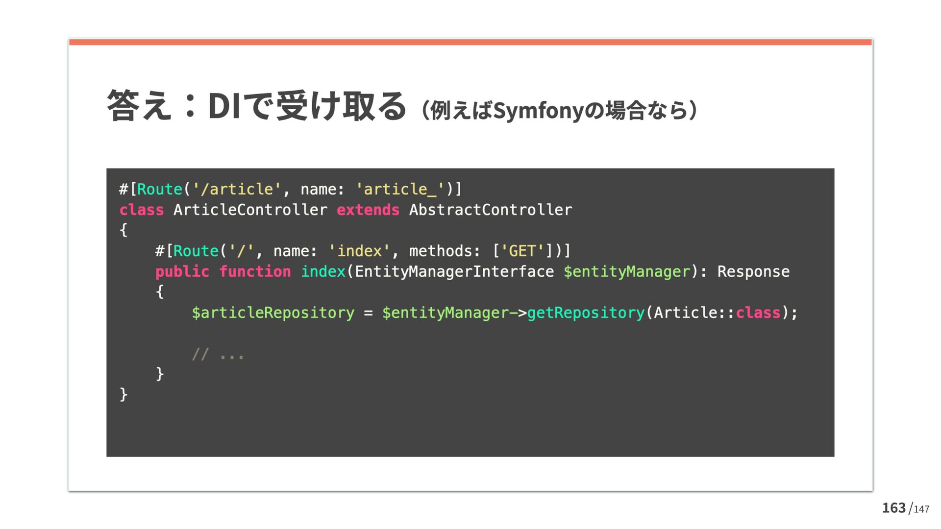 #[Route('/', name: 'index', methods: ['GET'])] public function index(EntityManagerInterface $entityManager): Response { $articleRepository = $entityManager->getRepository(Article::class); // ... } }  105 DI Symfony