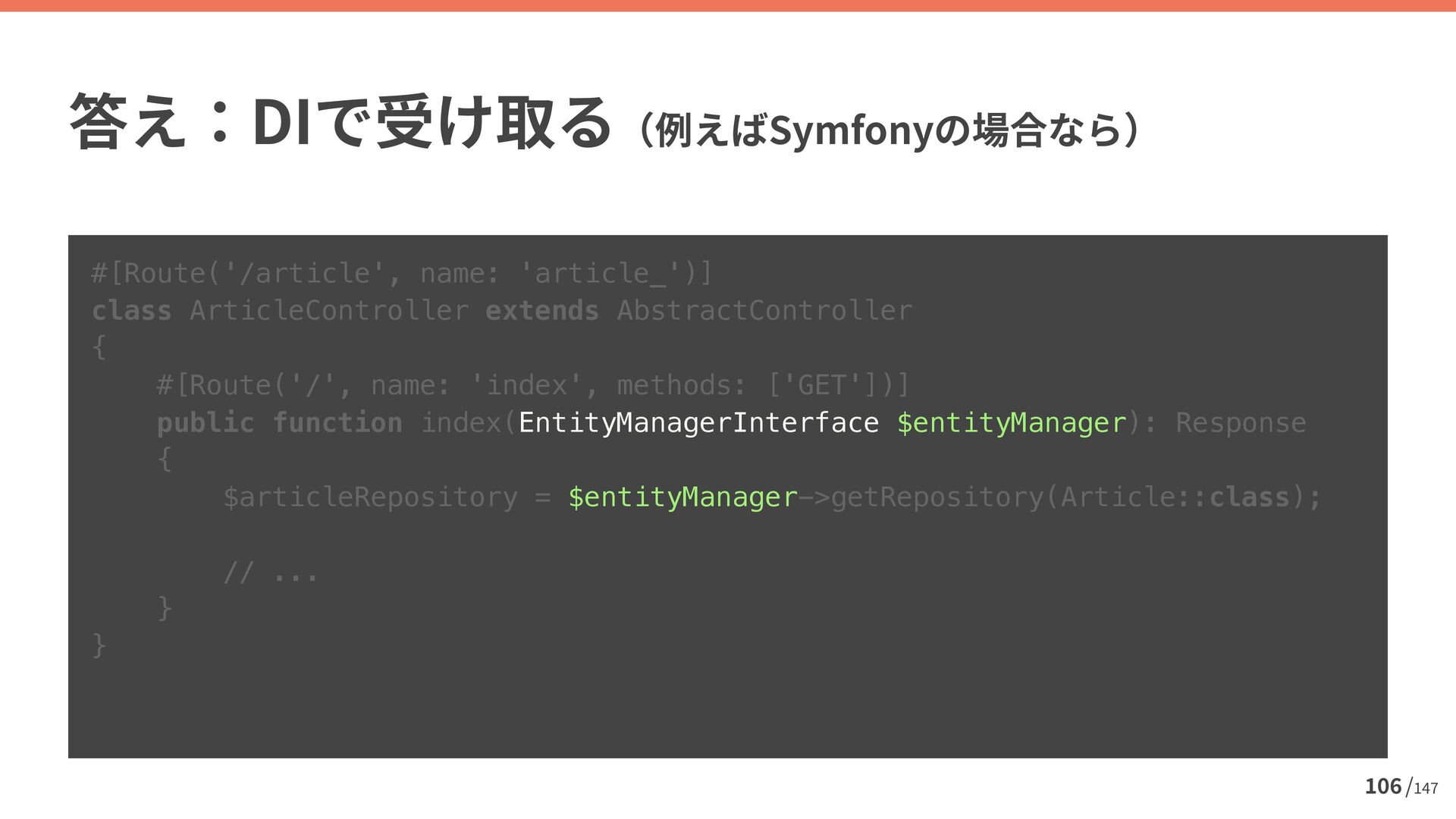 #[Route('/', name: 'index', methods: ['GET'])] public function index(EntityManagerInterface $entityManager): Response { $articleRepository = $entityManager->getRepository(Article::class); // ... } }  106 DI Symfony