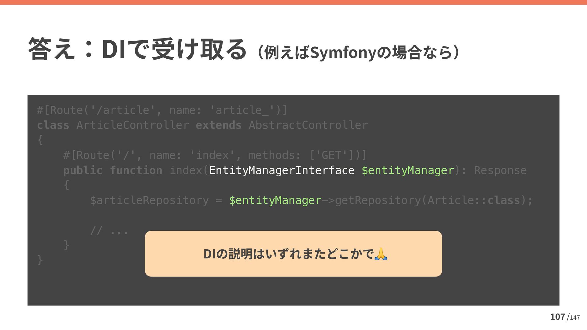 #[Route('/', name: 'index', methods: ['GET'])] public function index(EntityManagerInterface $entityManager): Response { $articleRepository = $entityManager->getRepository(Article::class); // ... } }  107 DI Symfony DI 🙏