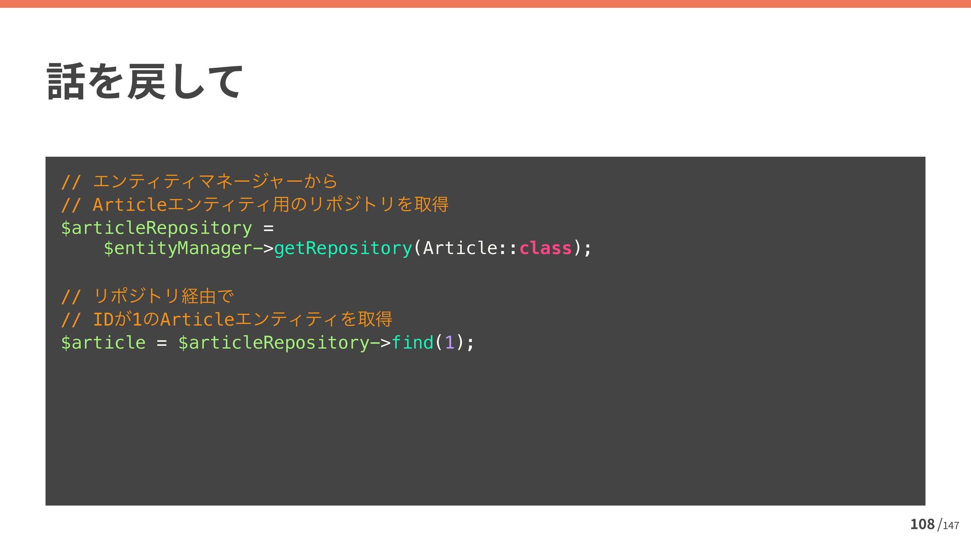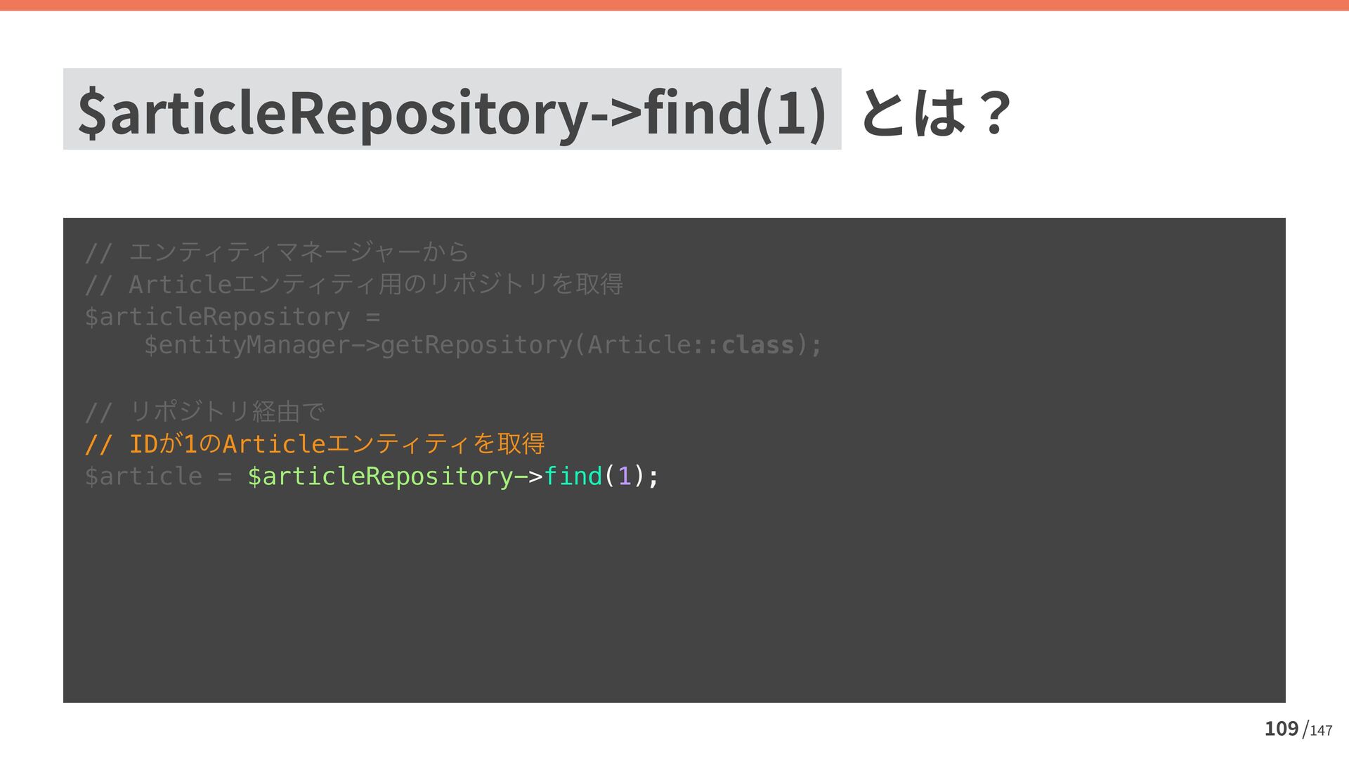 ϦϙδτϦܦ༝Ͱ // ID͕1ͷArticleΤϯςΟςΟΛऔಘ $article = $articleRepository->find(1);  108