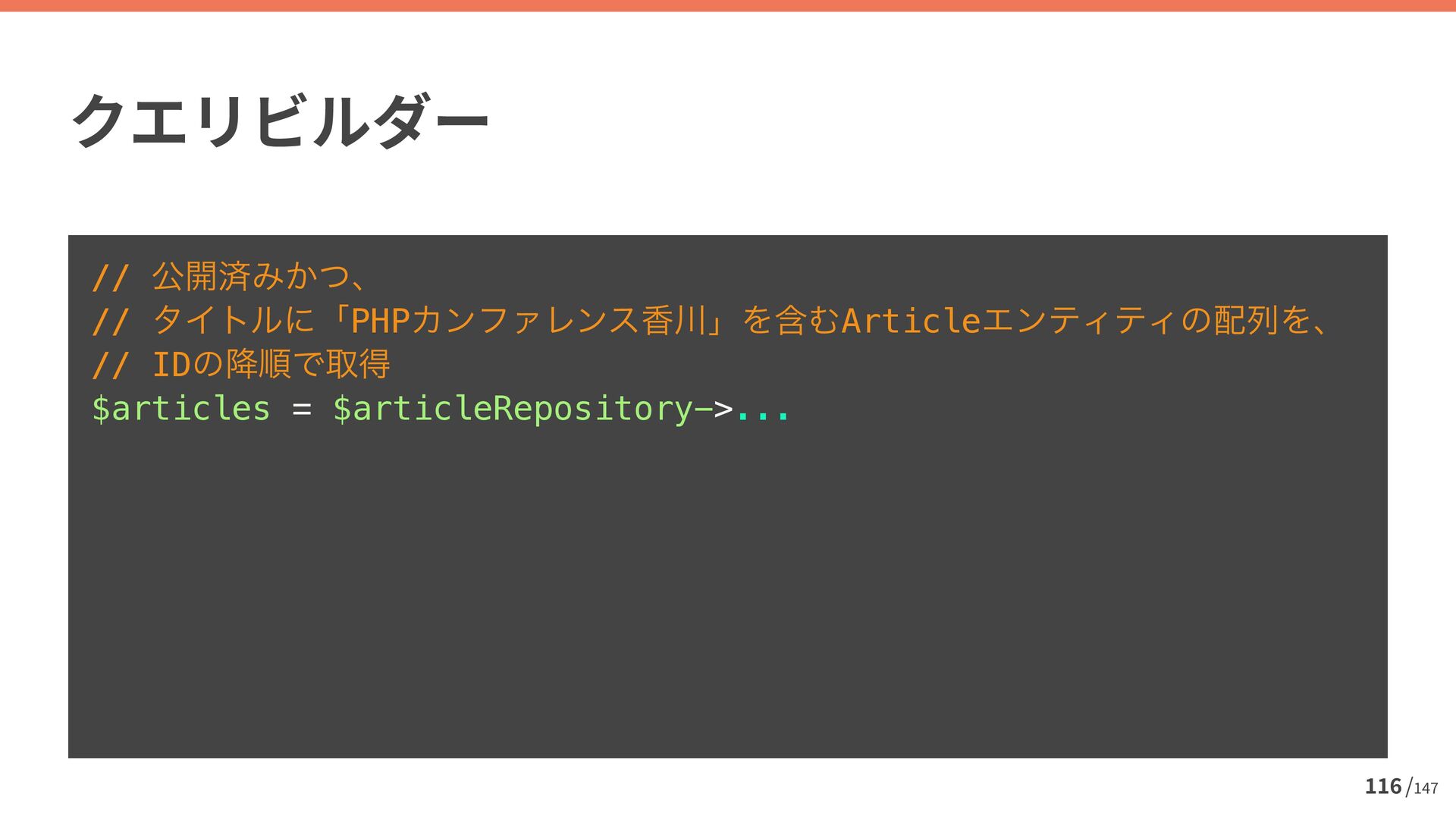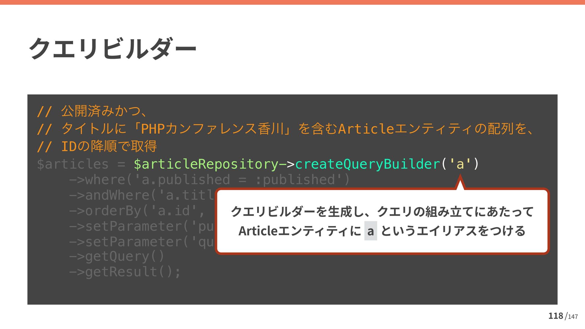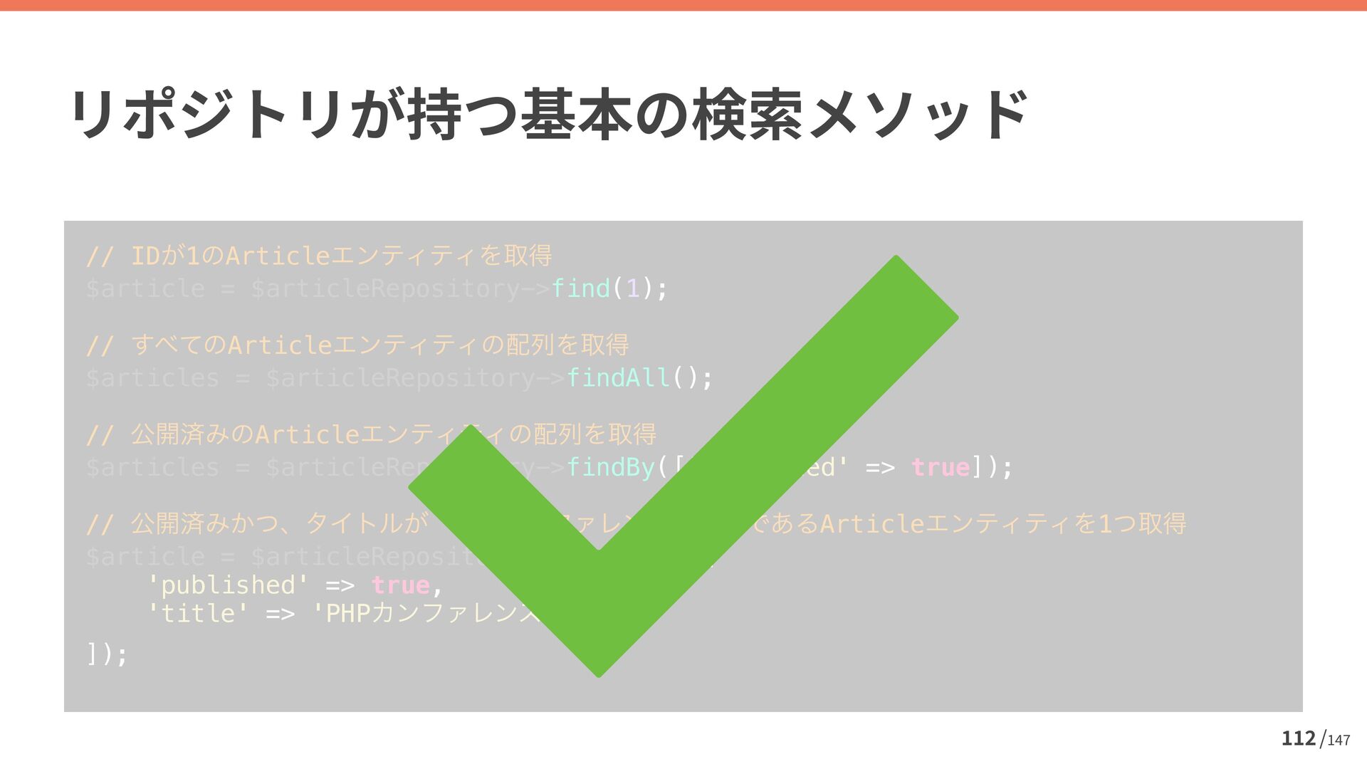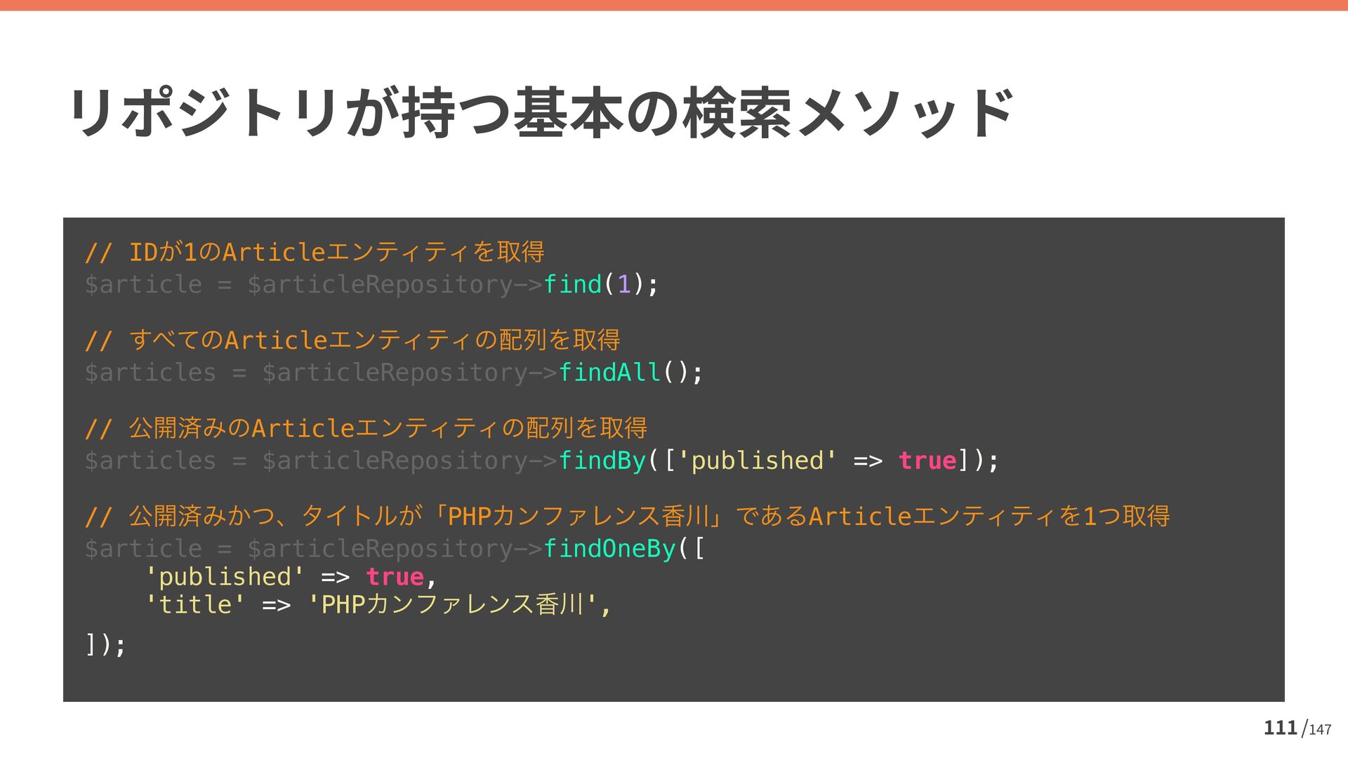 = $articleRepository->findAll(); // ެ։ࡁΈͷArticleΤϯςΟςΟͷ഑ྻΛऔಘ $articles = $articleRepository->findBy(['published' => true]); // ެ։ࡁΈ͔ͭɺλΠτϧ͕ʮPHPΧϯϑΝϨϯε߳઒ʯͰ͋ΔArticleΤϯςΟςΟΛ1ͭऔಘ $article = $articleRepository->findOneBy([ 'published' => true, 'title' => 'PHPΧϯϑΝϨϯε߳઒', ]);  112