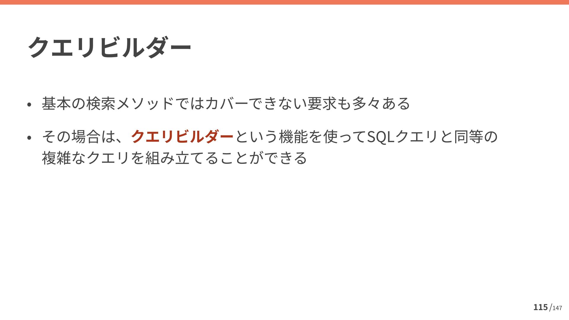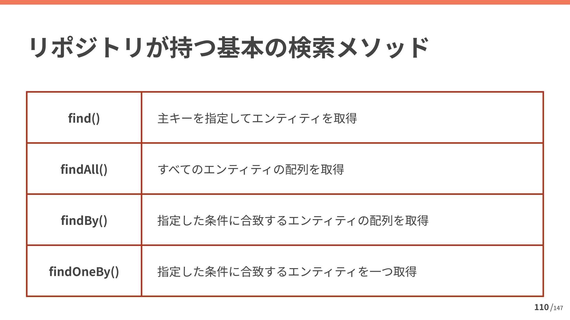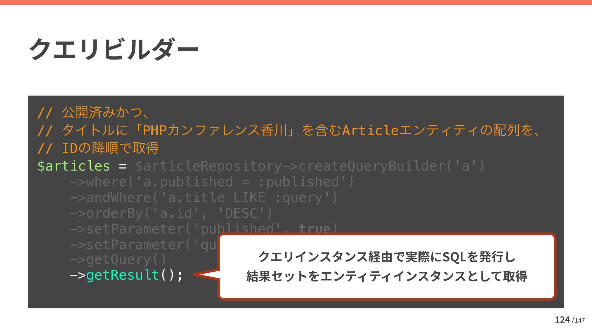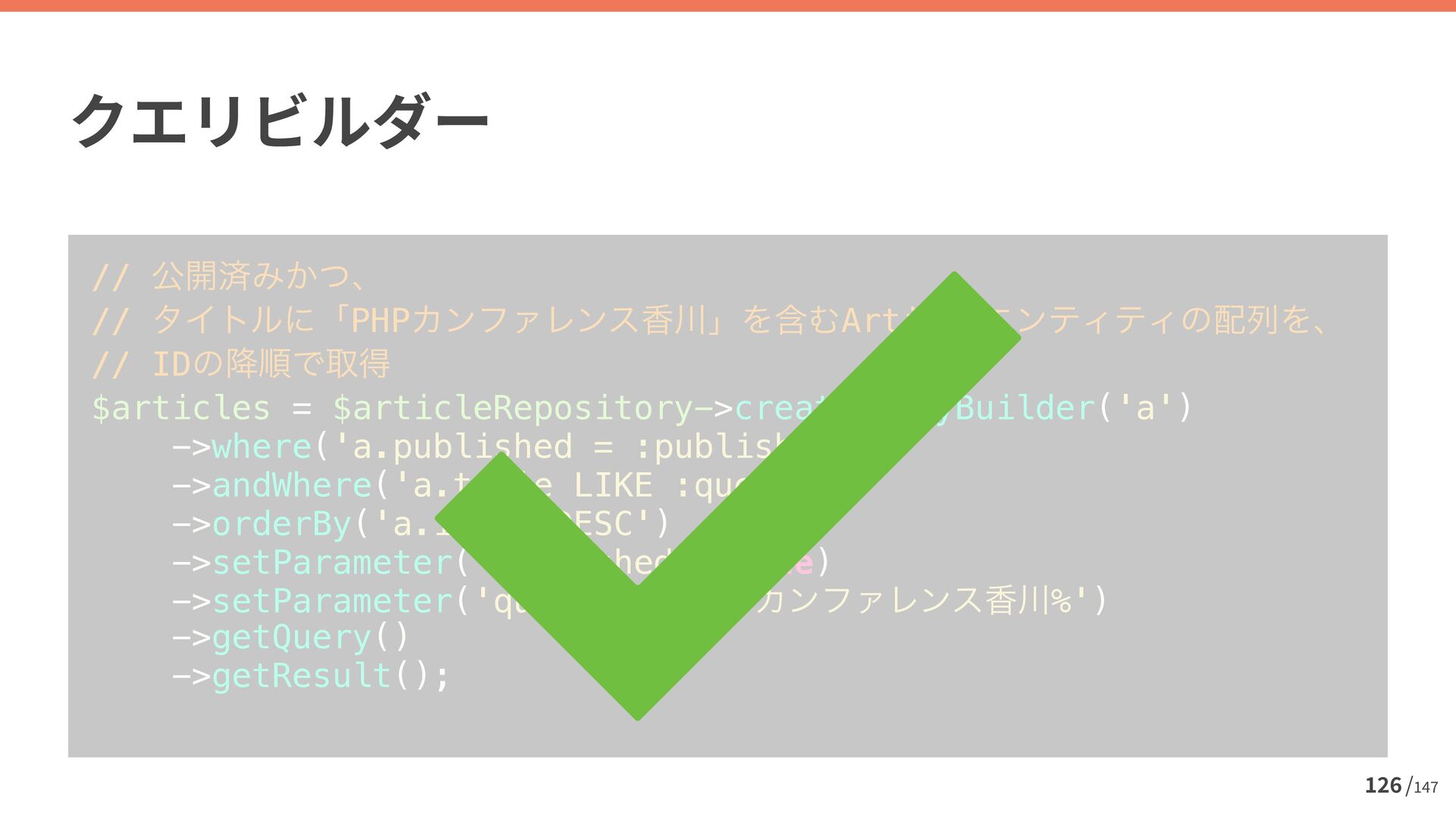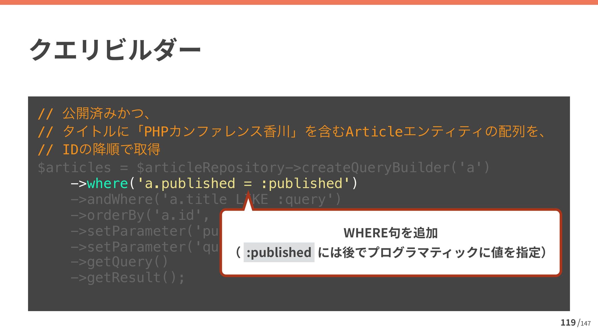 = $articleRepository->findAll(); // ެ։ࡁΈͷArticleΤϯςΟςΟͷ഑ྻΛऔಘ $articles = $articleRepository->findBy(['published' => true]); // ެ։ࡁΈ͔ͭɺλΠτϧ͕ʮPHPΧϯϑΝϨϯε߳઒ʯͰ͋ΔArticleΤϯςΟςΟΛ1ͭऔಘ $article = $articleRepository->findOneBy([ 'published' => true, 'title' => 'PHPΧϯϑΝϨϯε߳઒', ]);  112