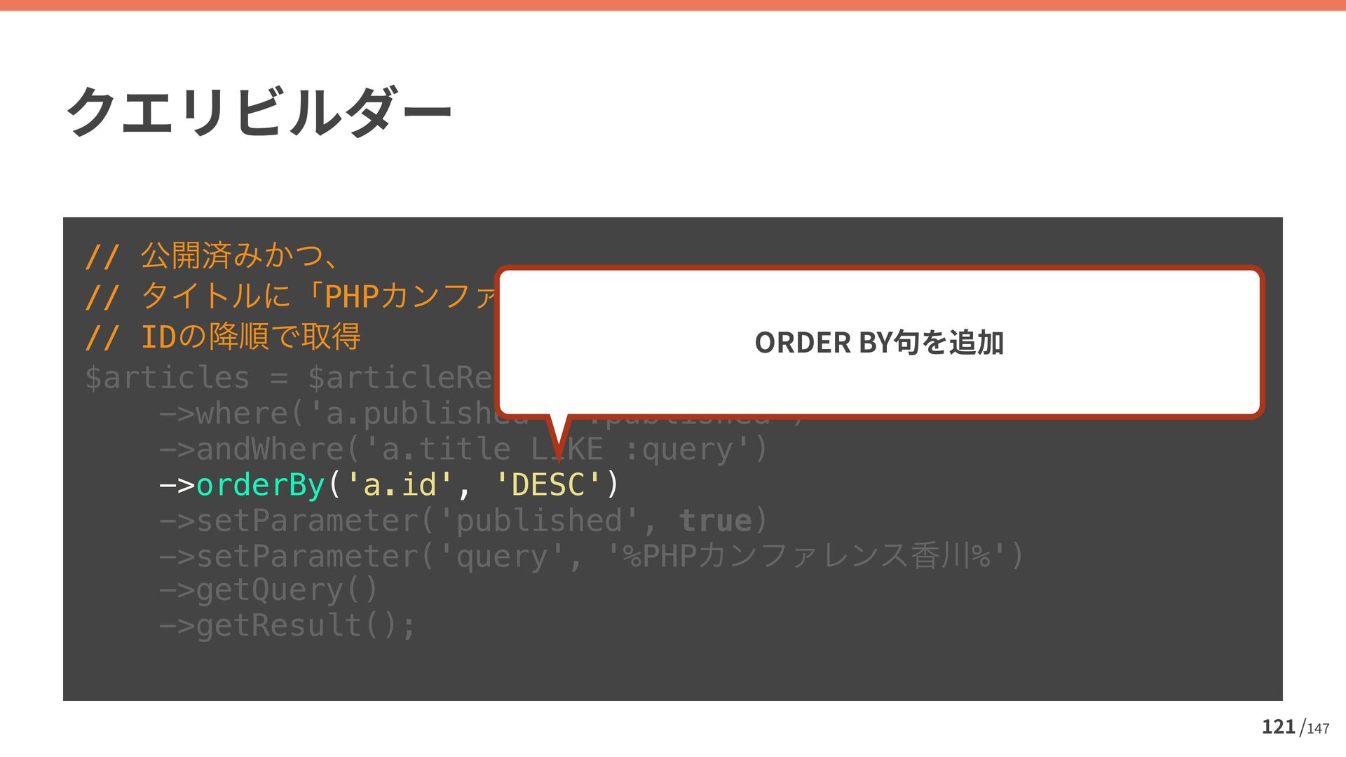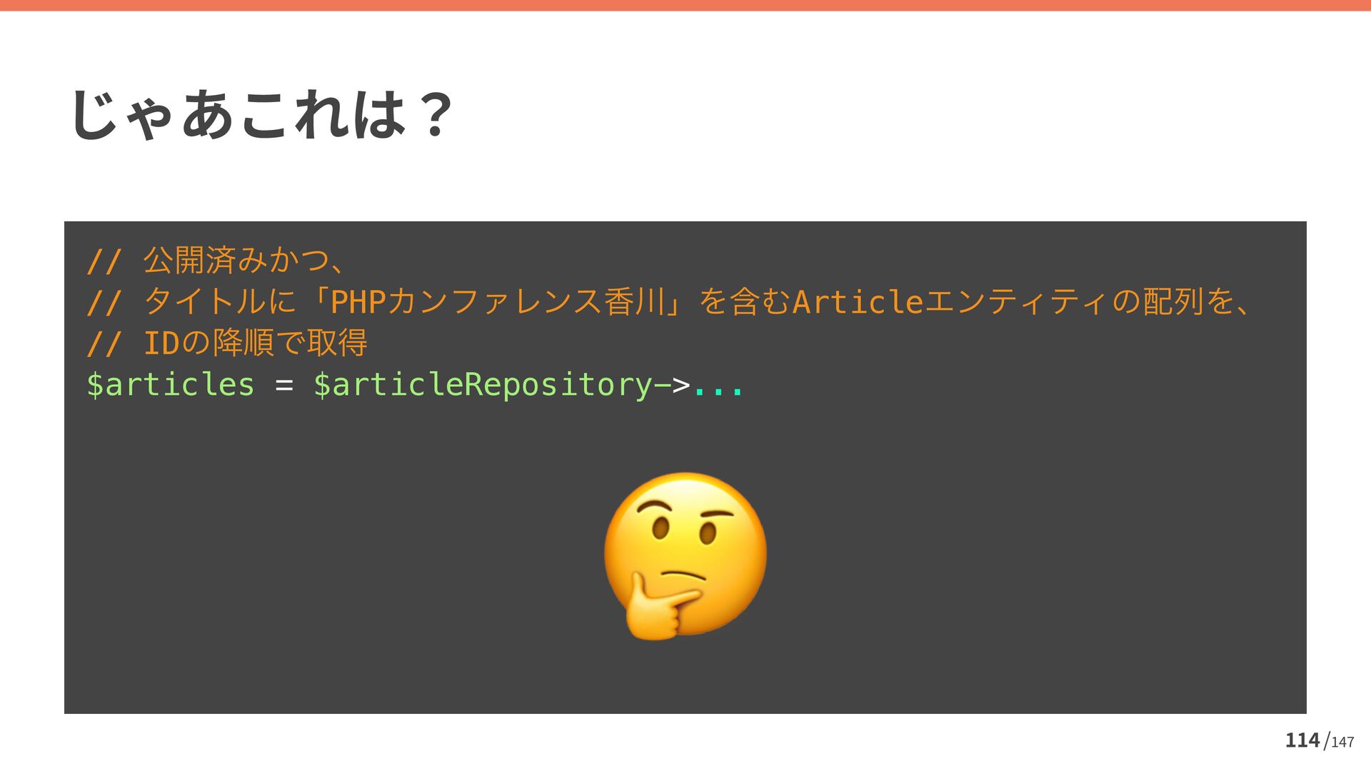 41. / 147 // ެ։ࡁΈ͔ͭɺ // λΠτϧʹʮPHPΧϯϑΝϨϯε߳઒ʯΛؚΉArticleΤϯςΟςΟͷ഑ྻΛɺ // IDͷ߱ॱͰऔಘ $articles =