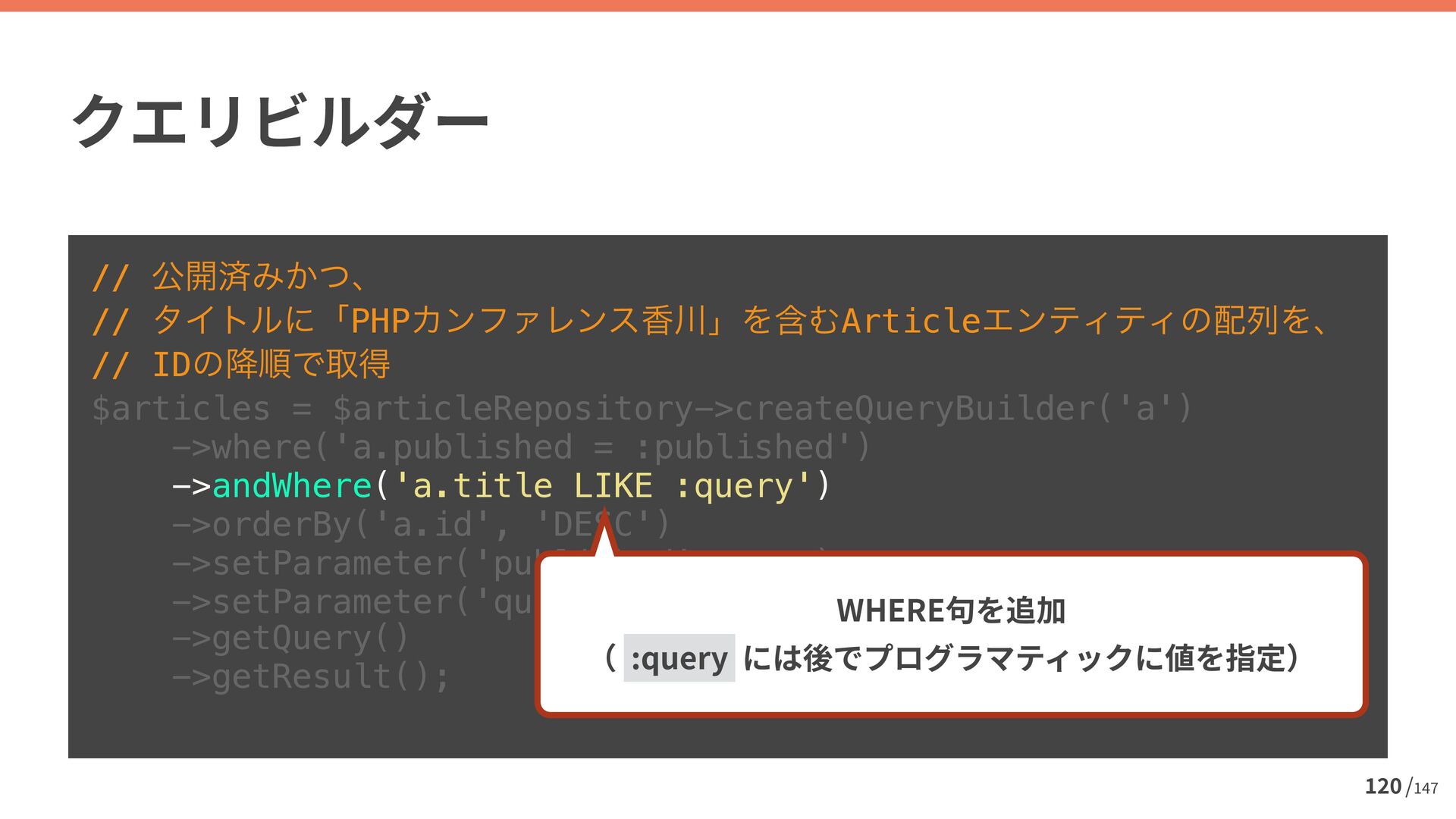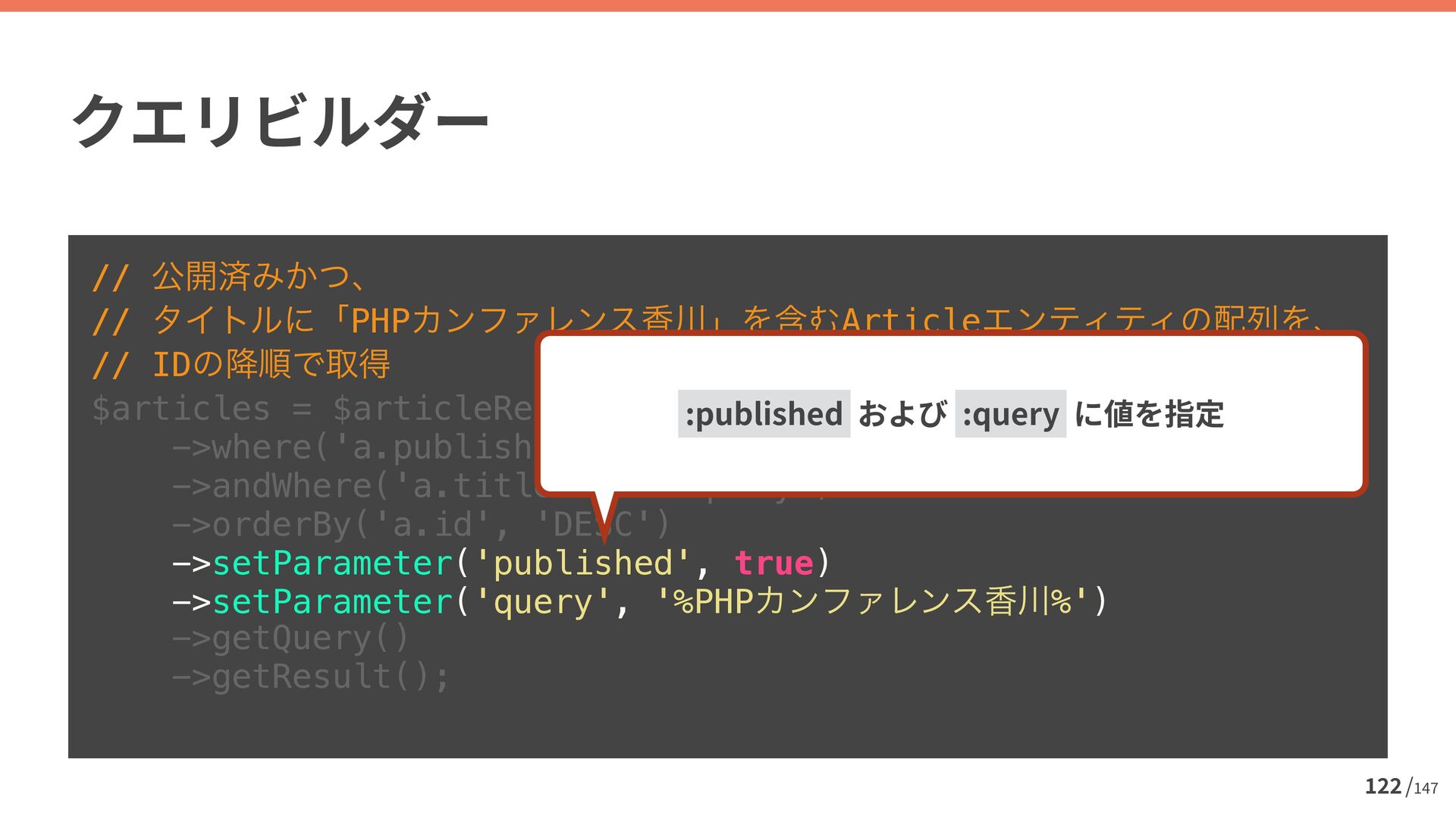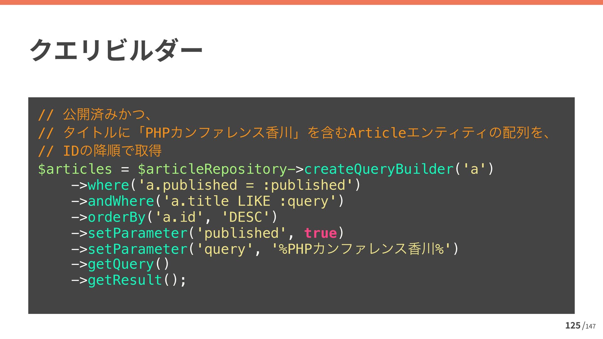 $articleRepository->createQueryBuilder('a') ->where('a.published = :published') ->andWhere('a.title LIKE :query') ->orderBy('a.id', 'DESC') ->setParameter('published', true) ->setParameter('query', '%PHPΧϯϑΝϨϯε߳઒%') ->getQuery() ->getResult();  124 SQL 行