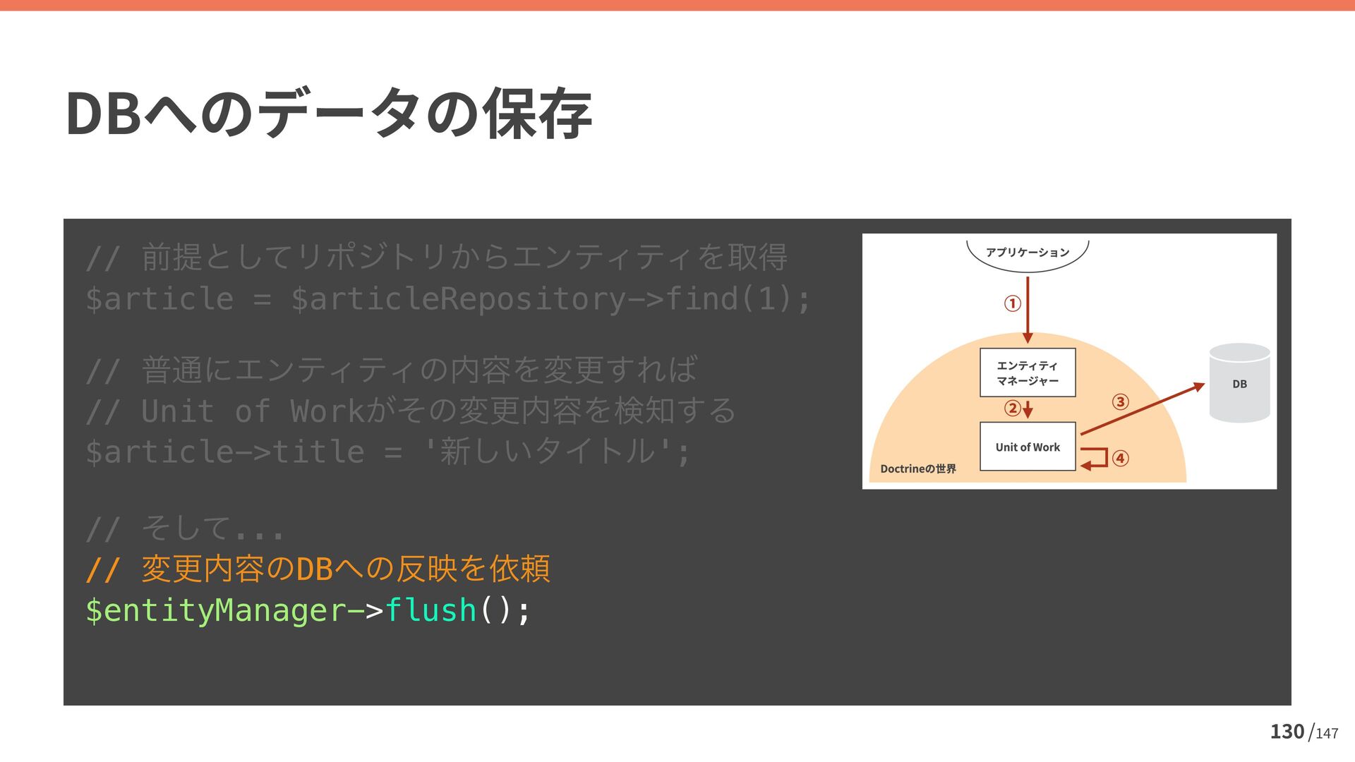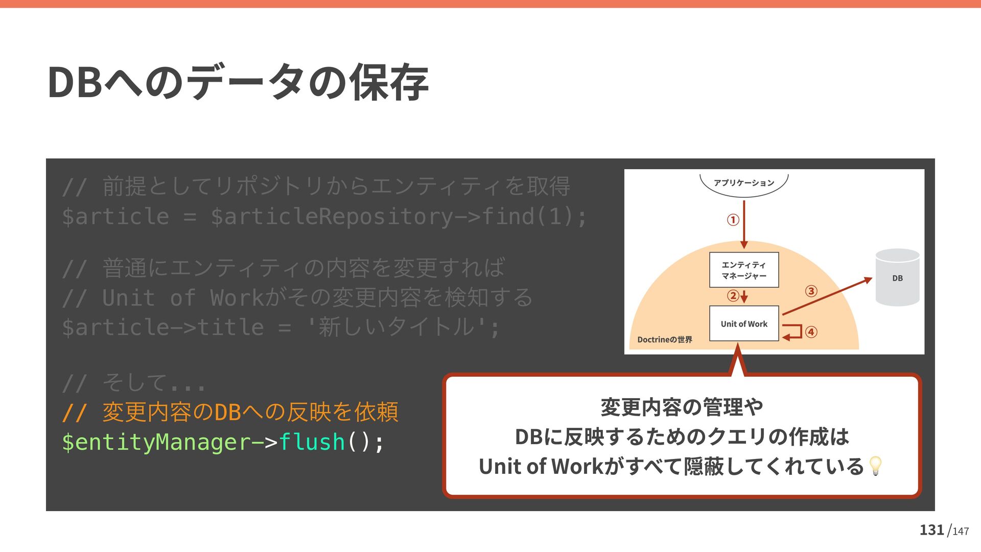 Unit of Work͕ͦͷมߋ಺༰Λݕ஌͢Δ $article->title = '৽͍͠λΠτϧ'; // ͦͯ͠... // มߋ಺༰ͷDB΁ͷ൓өΛґཔ $entityManager->flush();  130 DB
