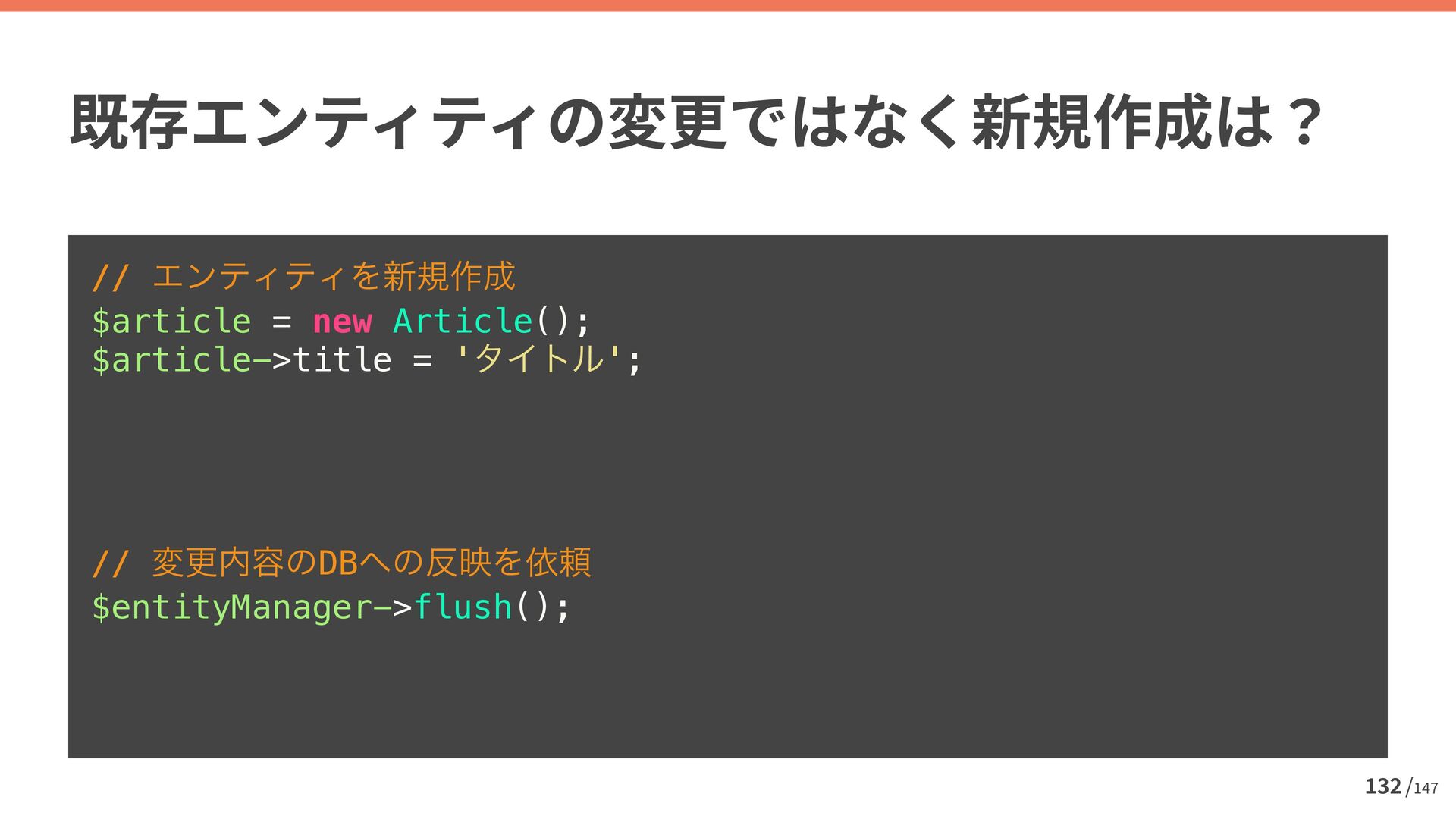 'λΠτϧ'; // ΤϯςΟςΟΛUnit of Workʹ௥Ճ $entityManager->persist($article); // มߋ಺༰ͷDB΁ͷ൓өΛґཔ $entityManager->flush();  132