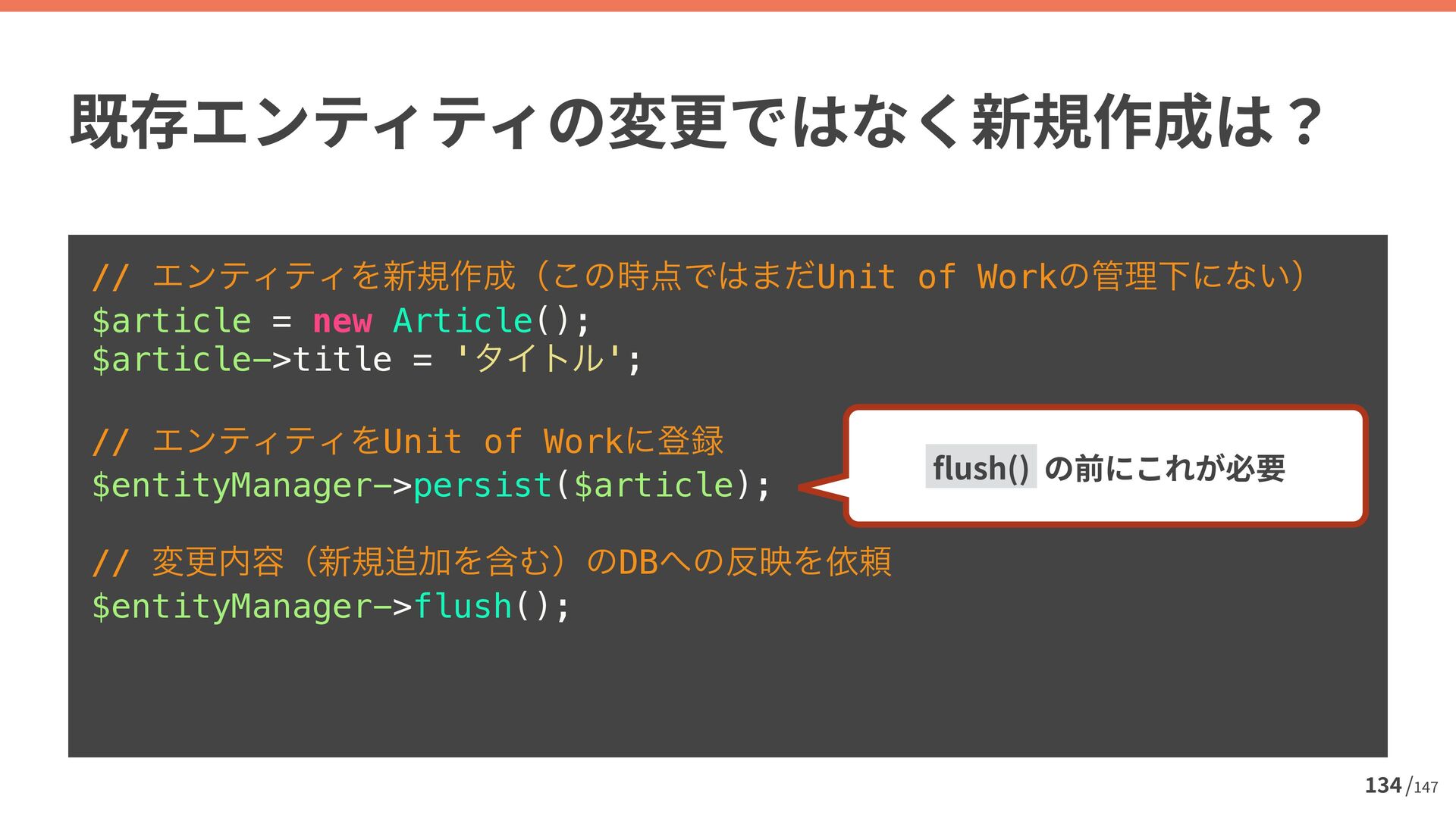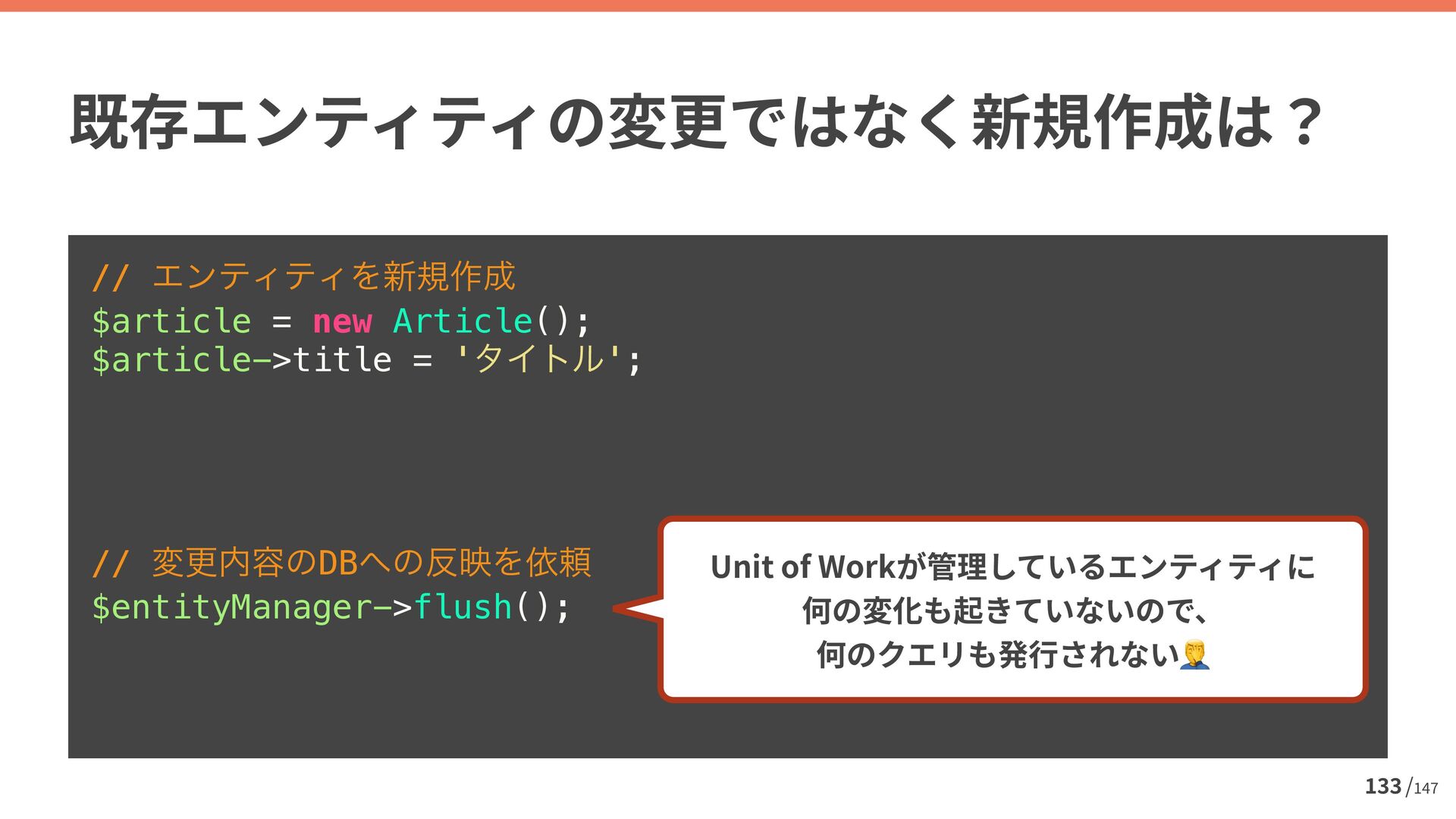 'λΠτϧ'; // ΤϯςΟςΟΛUnit of Workʹ௥Ճ $entityManager->persist($article); // มߋ಺༰ͷDB΁ͷ൓өΛґཔ $entityManager->flush();  133 Unit of Work 行 🤦