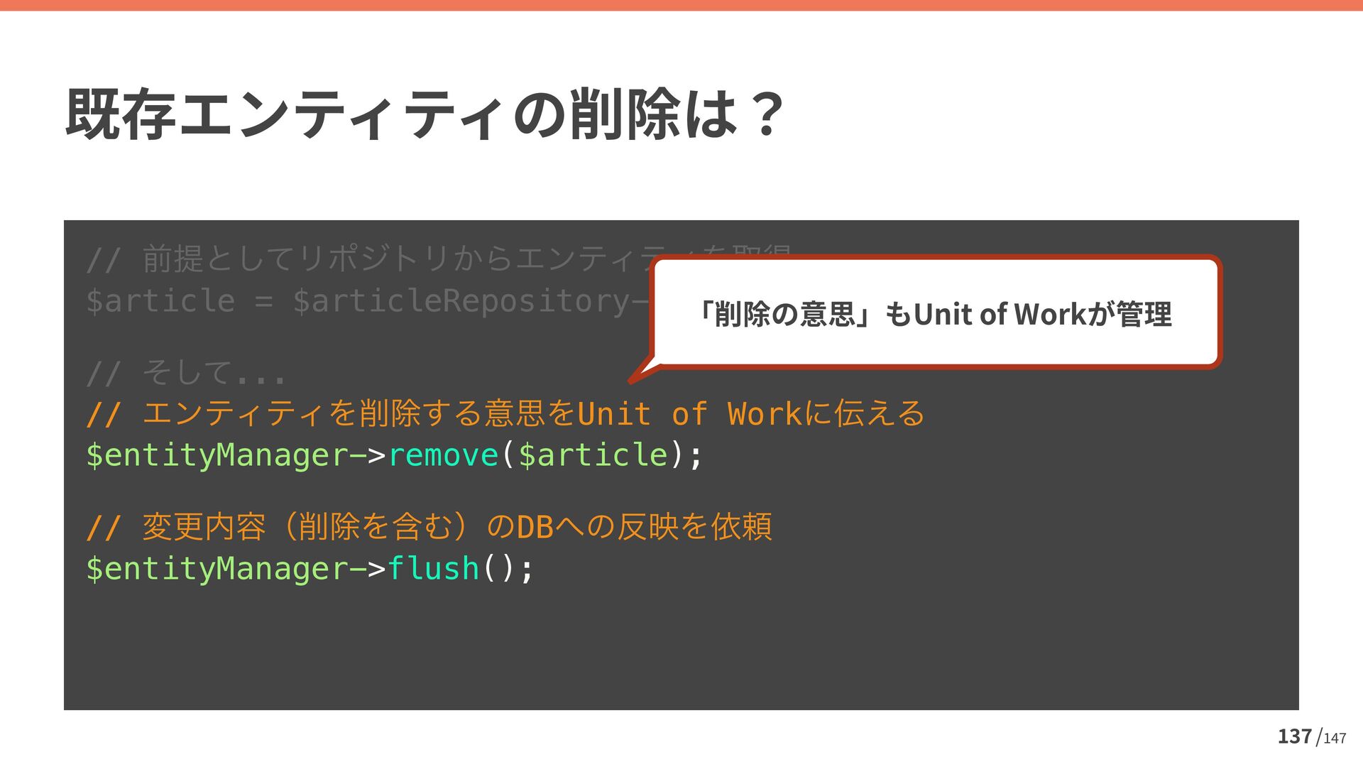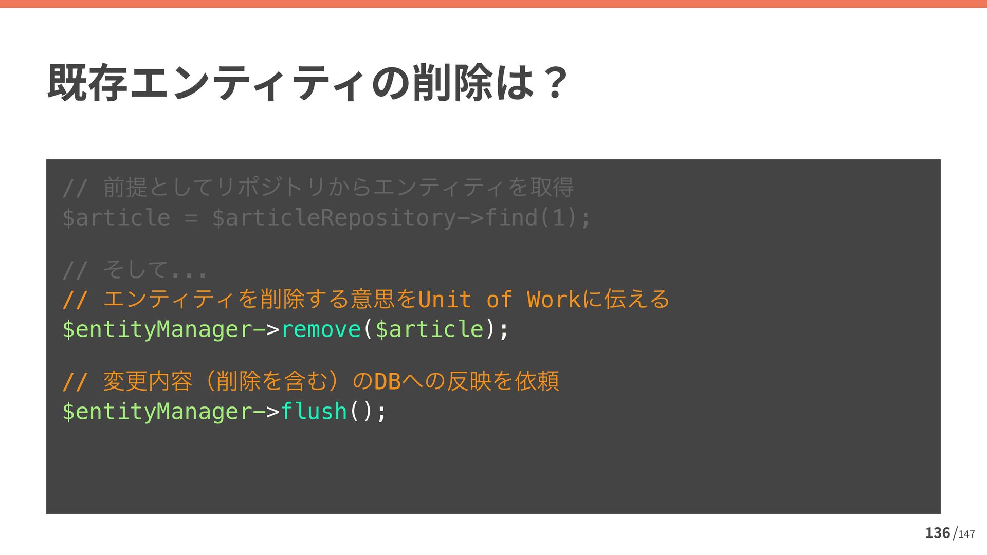 ΤϯςΟςΟΛ࡟আ͢ΔҙࢥΛUnit of Workʹ఻͑Δ $entityManager->remove($article); // มߋ಺༰ʢ࡟আΛؚΉʣͷDB΁ͷ൓өΛґཔ $entityManager->flush();  136