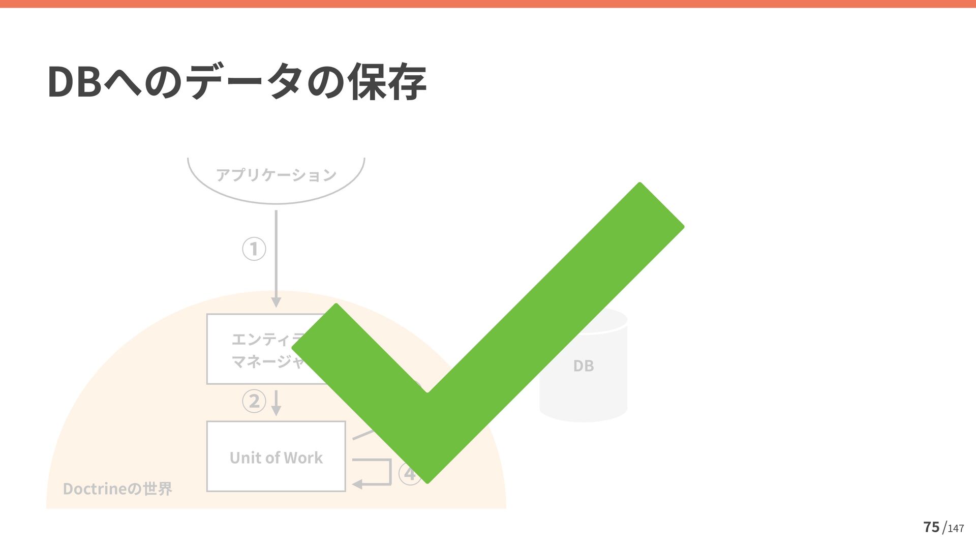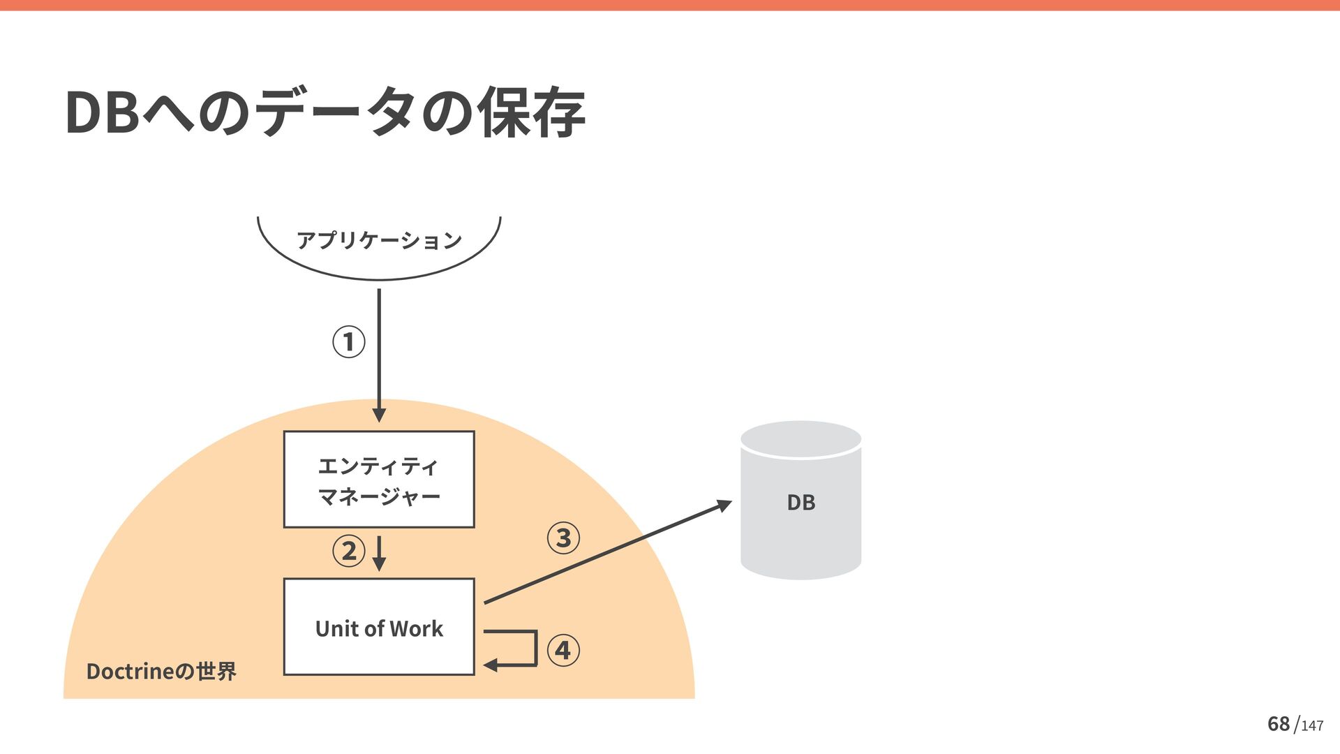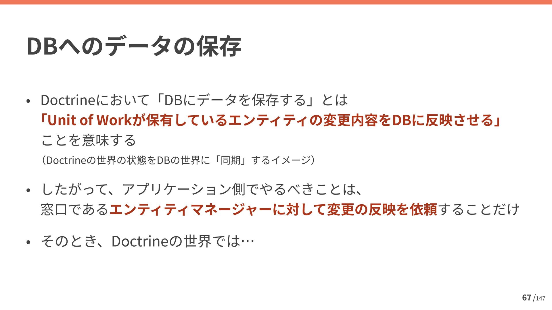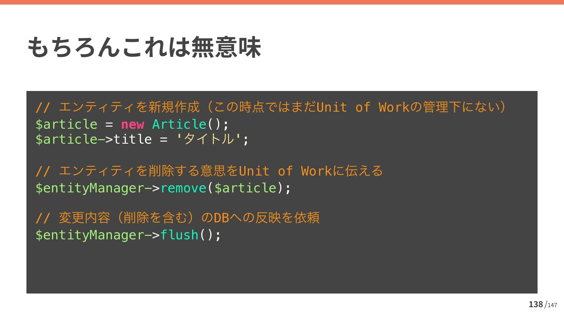 ΤϯςΟςΟΛ࡟আ͢ΔҙࢥΛUnit of Workʹ఻͑Δ $entityManager->remove($article); // มߋ಺༰ʢ࡟আΛؚΉʣͷDB΁ͷ൓өΛґཔ $entityManager->flush();  137 Unit of Work