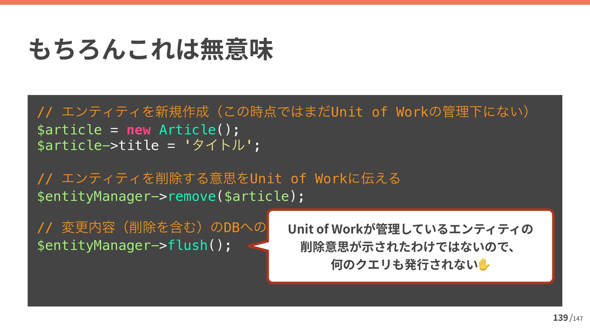 $article->title = 'λΠτϧ'; // ΤϯςΟςΟΛ࡟আ͢ΔҙࢥΛUnit of Workʹ఻͑Δ $entityManager->remove($article); // มߋ಺༰ʢ࡟আΛؚΉʣͷDB΁ͷ൓өΛґཔ $entityManager->flush();  138