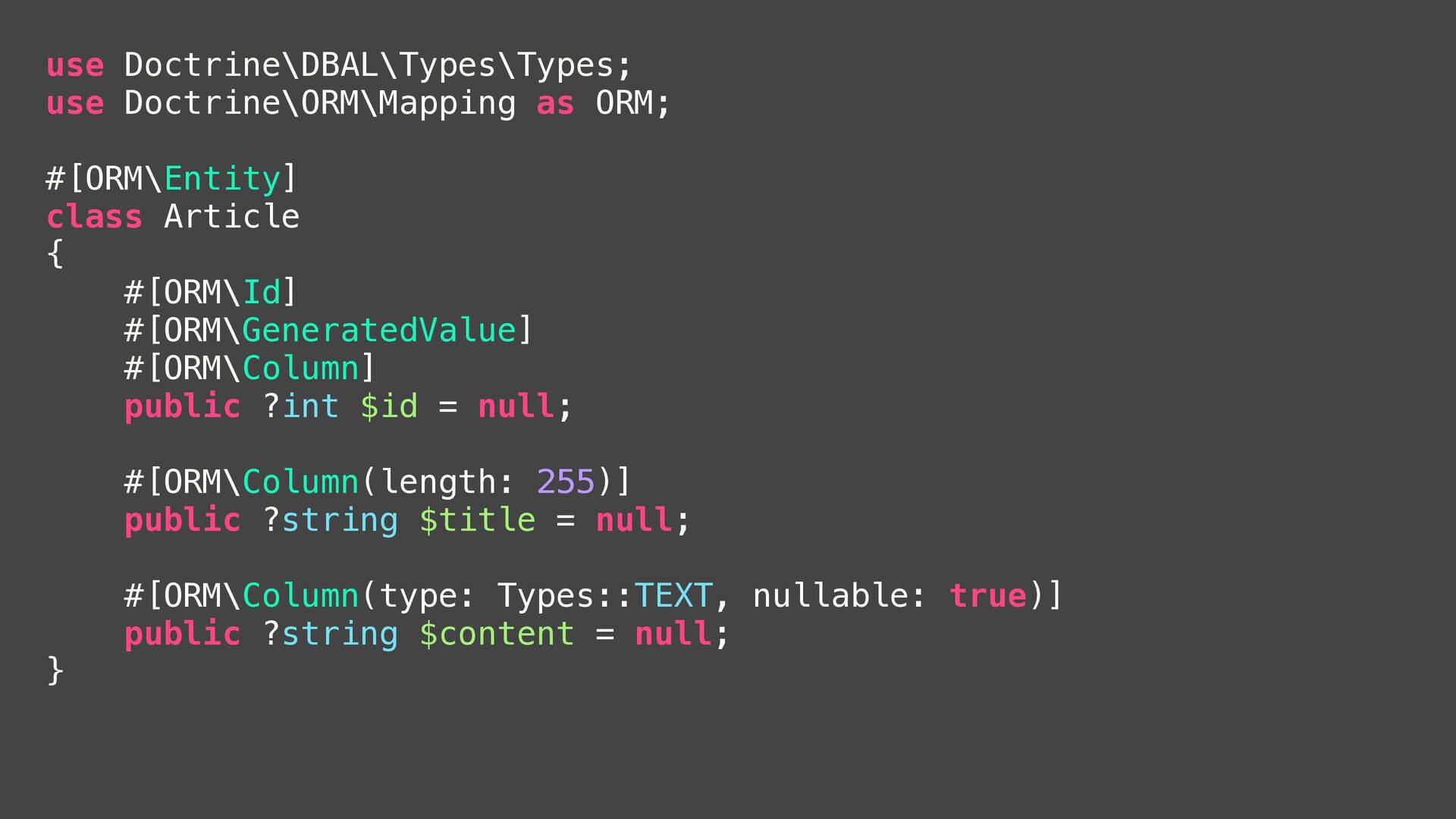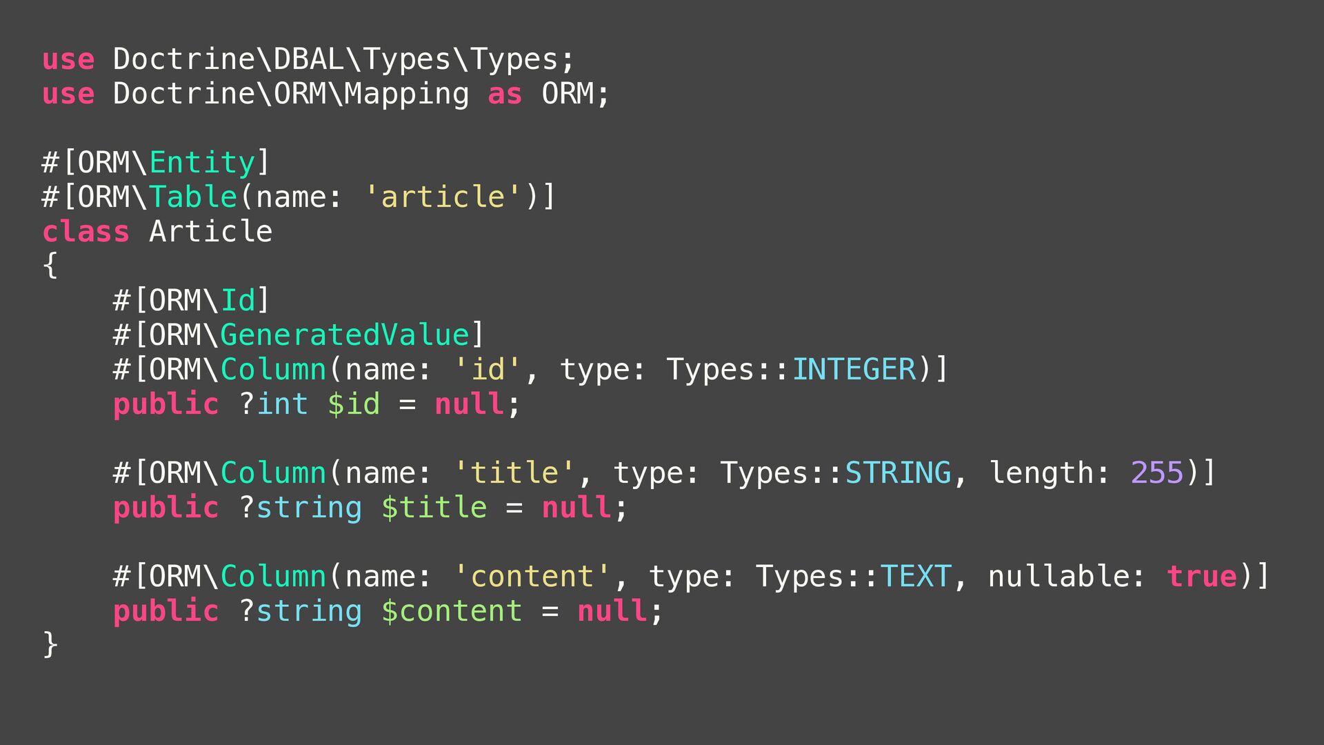 as ORM; #[ORM\Entity] #[ORM\Table(name: 'article')] class Article { #[ORM\Id] #[ORM\GeneratedValue] #[ORM\Column(name: 'id', type: Types::INTEGER)] public ?int $id = null; #[ORM\Column(name: 'title', type: Types::STRING, length: 255)] public ?string $title = null; #[ORM\Column(name: 'content', type: Types::TEXT, nullable: true)] public ?string $content = null; } ORM Doctrine