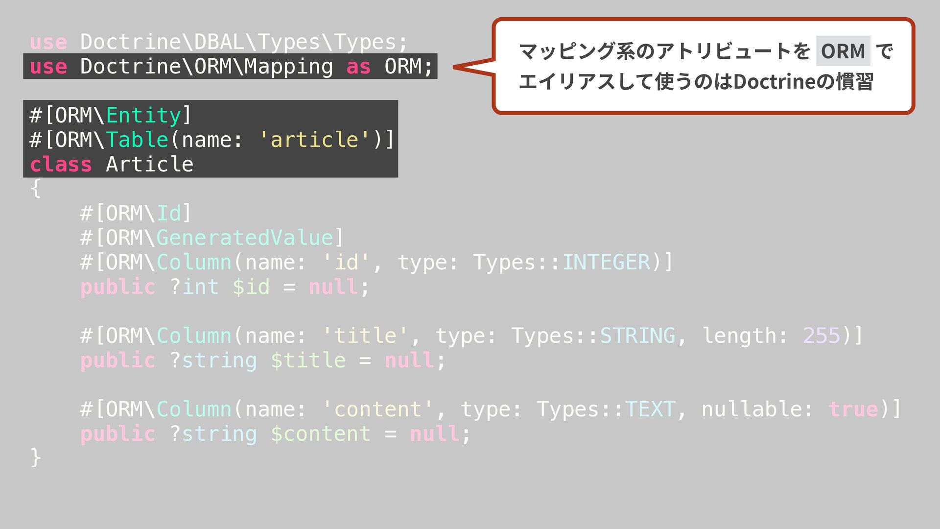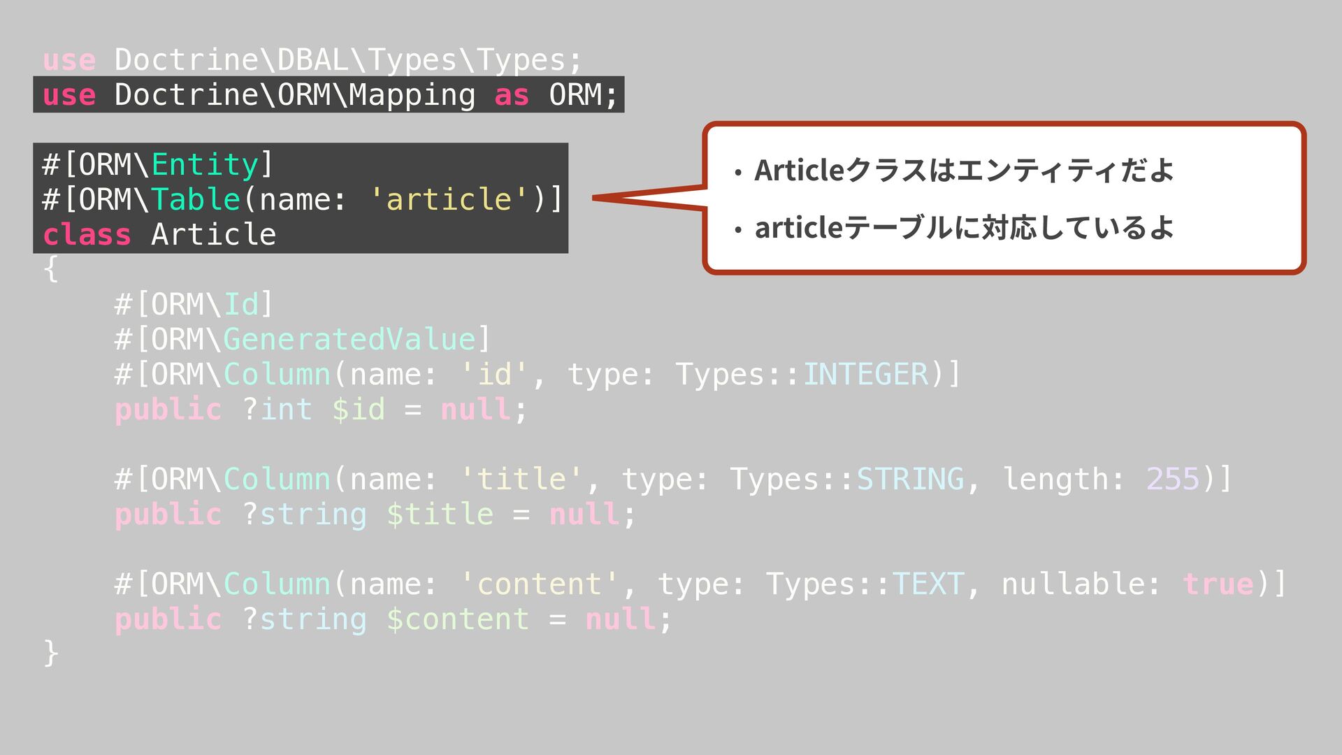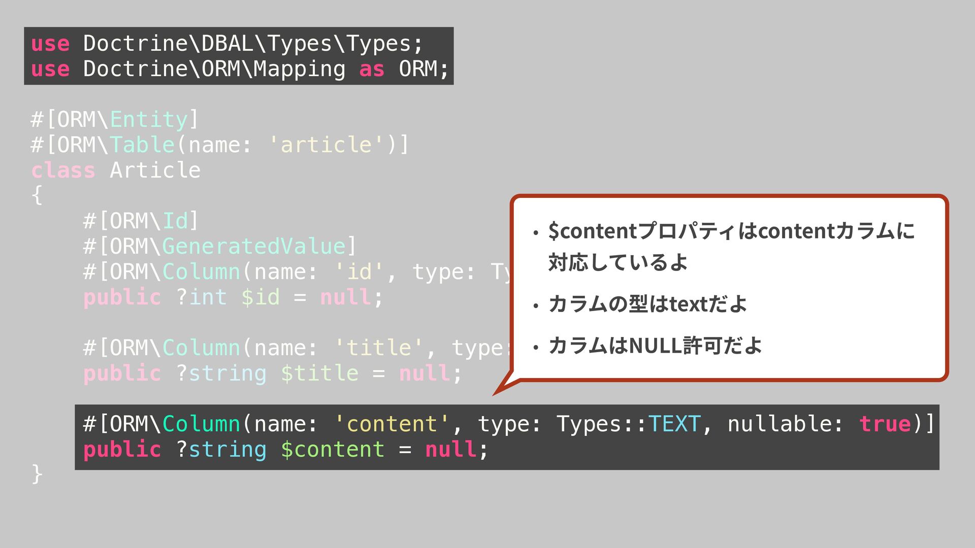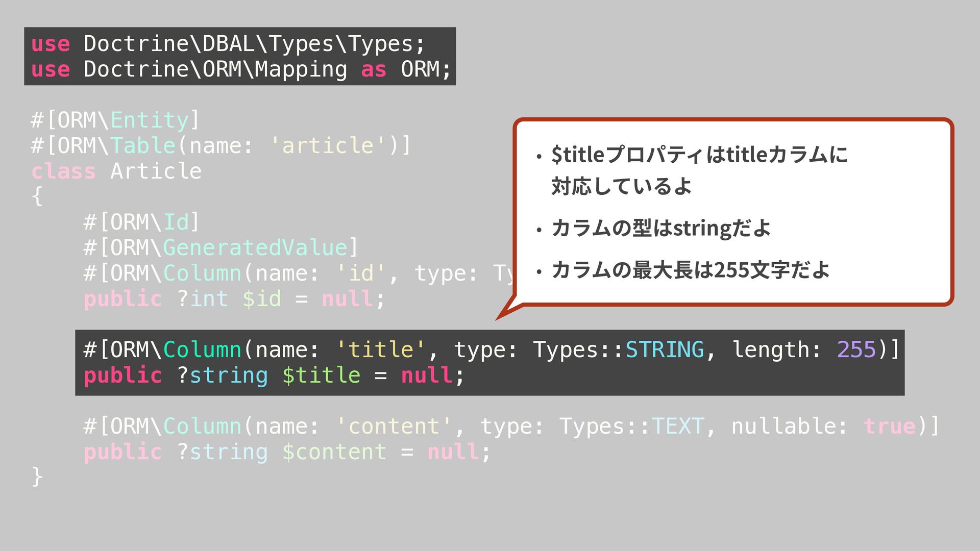 as ORM; #[ORM\Entity] #[ORM\Table(name: 'article')] class Article { #[ORM\Id] #[ORM\GeneratedValue] #[ORM\Column(name: 'id', type: Types::INTEGER)] public ?int $id = null; #[ORM\Column(name: 'title', type: Types::STRING, length: 255)] public ?string $title = null; #[ORM\Column(name: 'content', type: Types::TEXT, nullable: true)] public ?string $content = null; } $title title string 大長 255 文