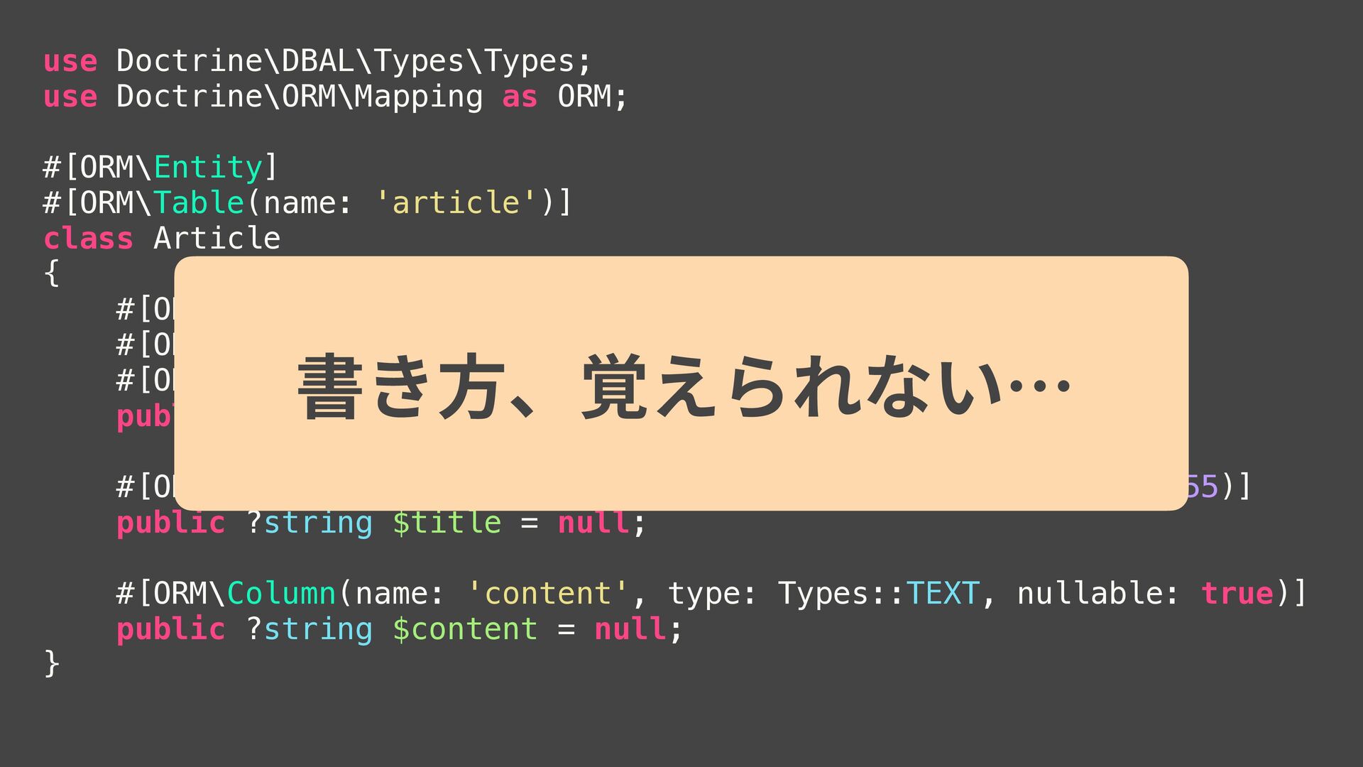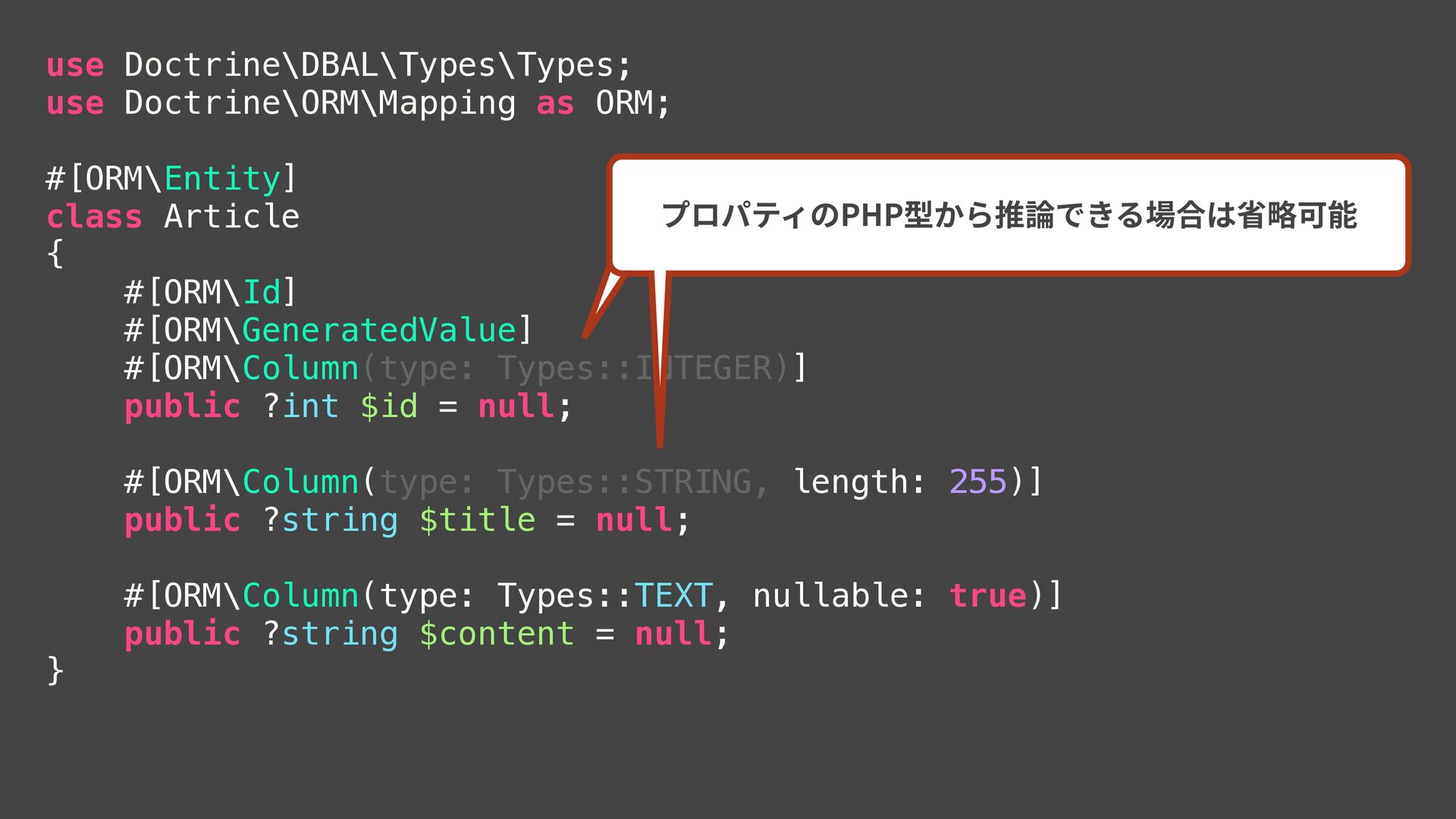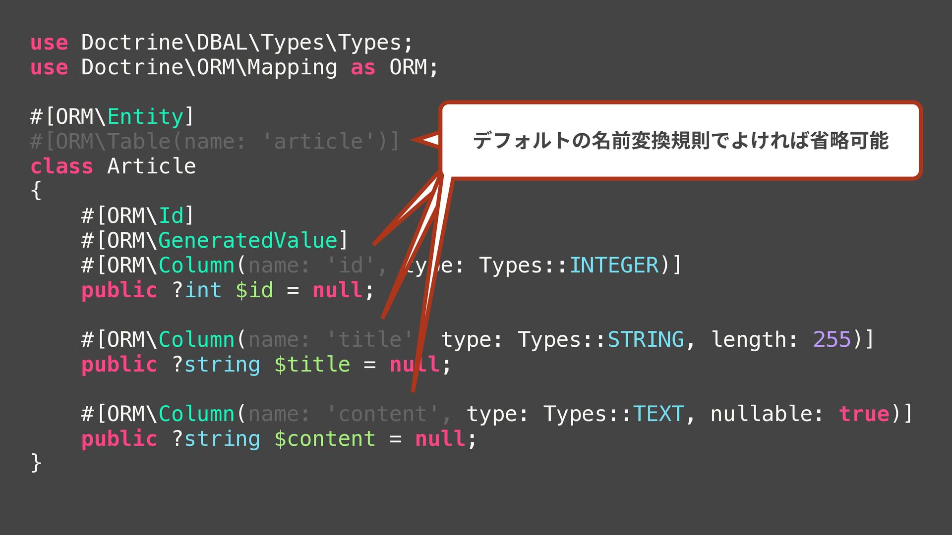as ORM; #[ORM\Entity] #[ORM\Table(name: 'article')] class Article { #[ORM\Id] #[ORM\GeneratedValue] #[ORM\Column(name: 'id', type: Types::INTEGER)] public ?int $id = null; #[ORM\Column(name: 'title', type: Types::STRING, length: 255)] public ?string $title = null; #[ORM\Column(name: 'content', type: Types::TEXT, nullable: true)] public ?string $content = null; } $title title string 大長 255 文