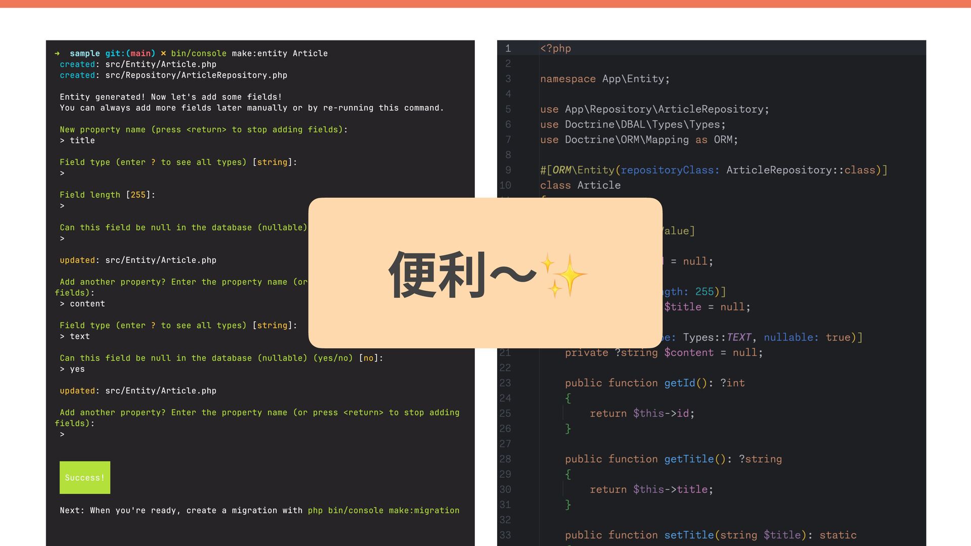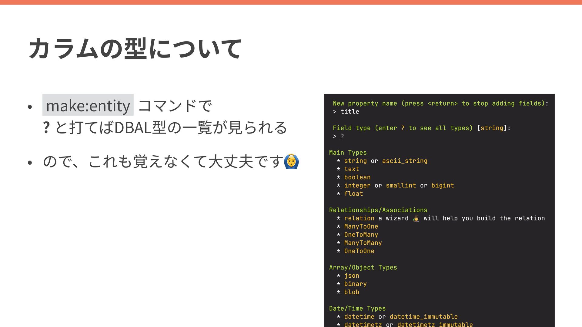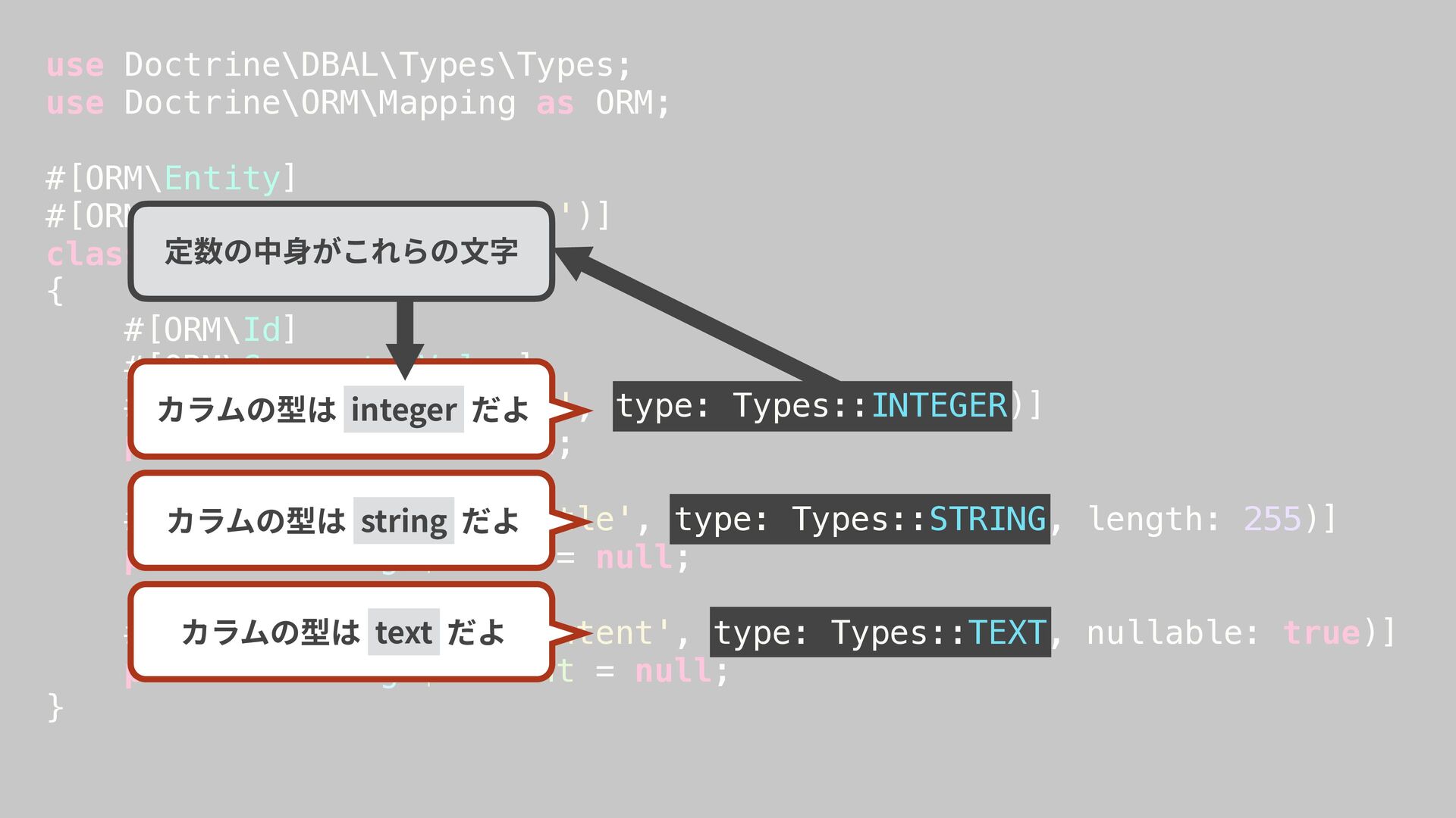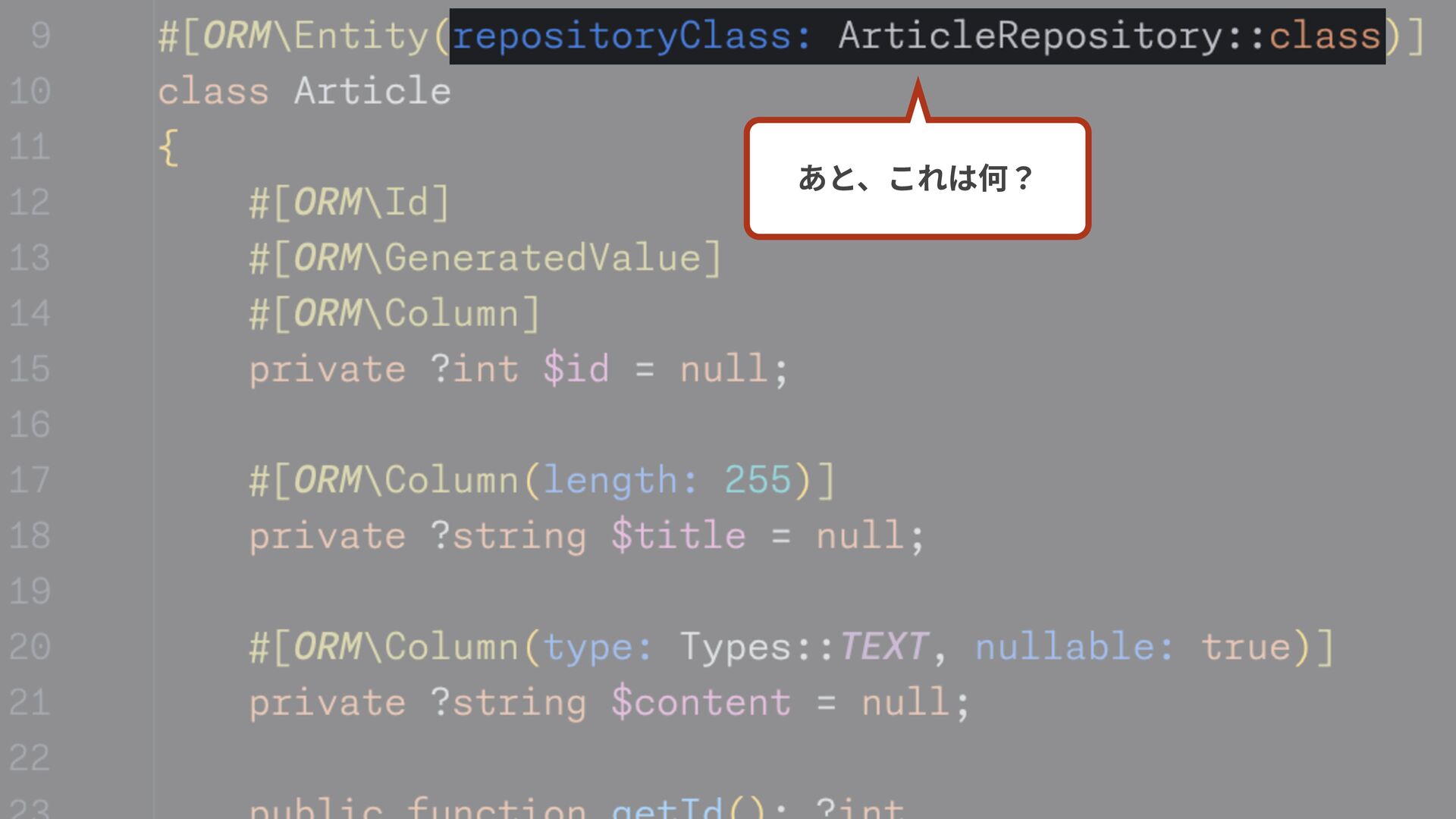 as ORM; #[ORM\Entity] #[ORM\Table(name: 'article')] class Article { #[ORM\Id] #[ORM\GeneratedValue] #[ORM\Column(name: 'id', type: Types::INTEGER)] public ?int $id = null; #[ORM\Column(name: 'title', type: Types::STRING, length: 255)] public ?string $title = null; #[ORM\Column(name: 'content', type: Types::TEXT, nullable: true)] public ?string $content = null; } $title title string 大長 255 文