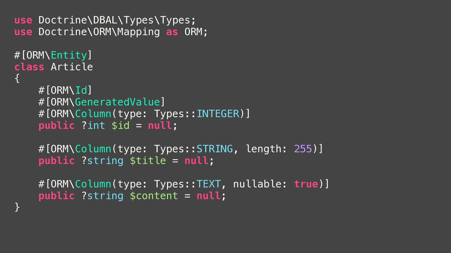 as ORM; #[ORM\Entity] class Article { #[ORM\Id] #[ORM\GeneratedValue] #[ORM\Column(type: Types::INTEGER)] public ?int $id = null; #[ORM\Column(type: Types::STRING, length: 255)] public ?string $title = null; #[ORM\Column(type: Types::TEXT, nullable: true)] public ?string $content = null; }