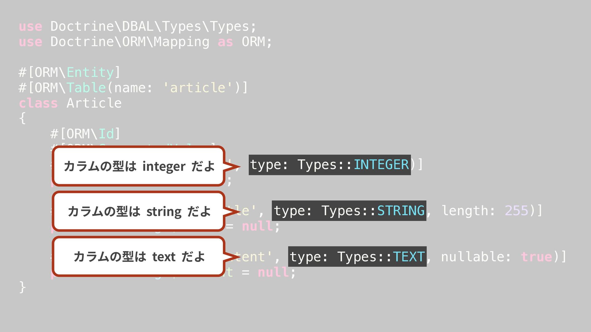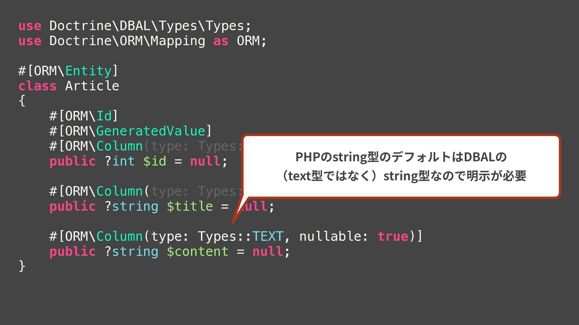 as ORM; #[ORM\Entity] class Article { #[ORM\Id] #[ORM\GeneratedValue] #[ORM\Column(type: Types::INTEGER)] public ?int $id = null; #[ORM\Column(type: Types::STRING, length: 255)] public ?string $title = null; #[ORM\Column(type: Types::TEXT, nullable: true)] public ?string $content = null; } PHP string DBAL text string 示