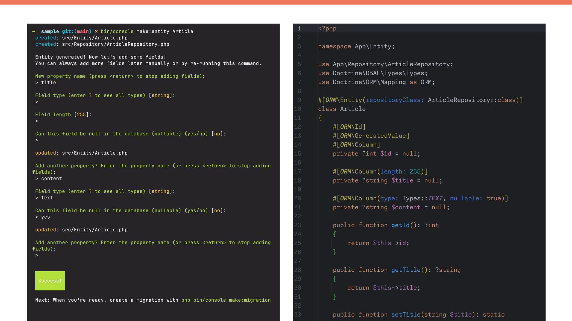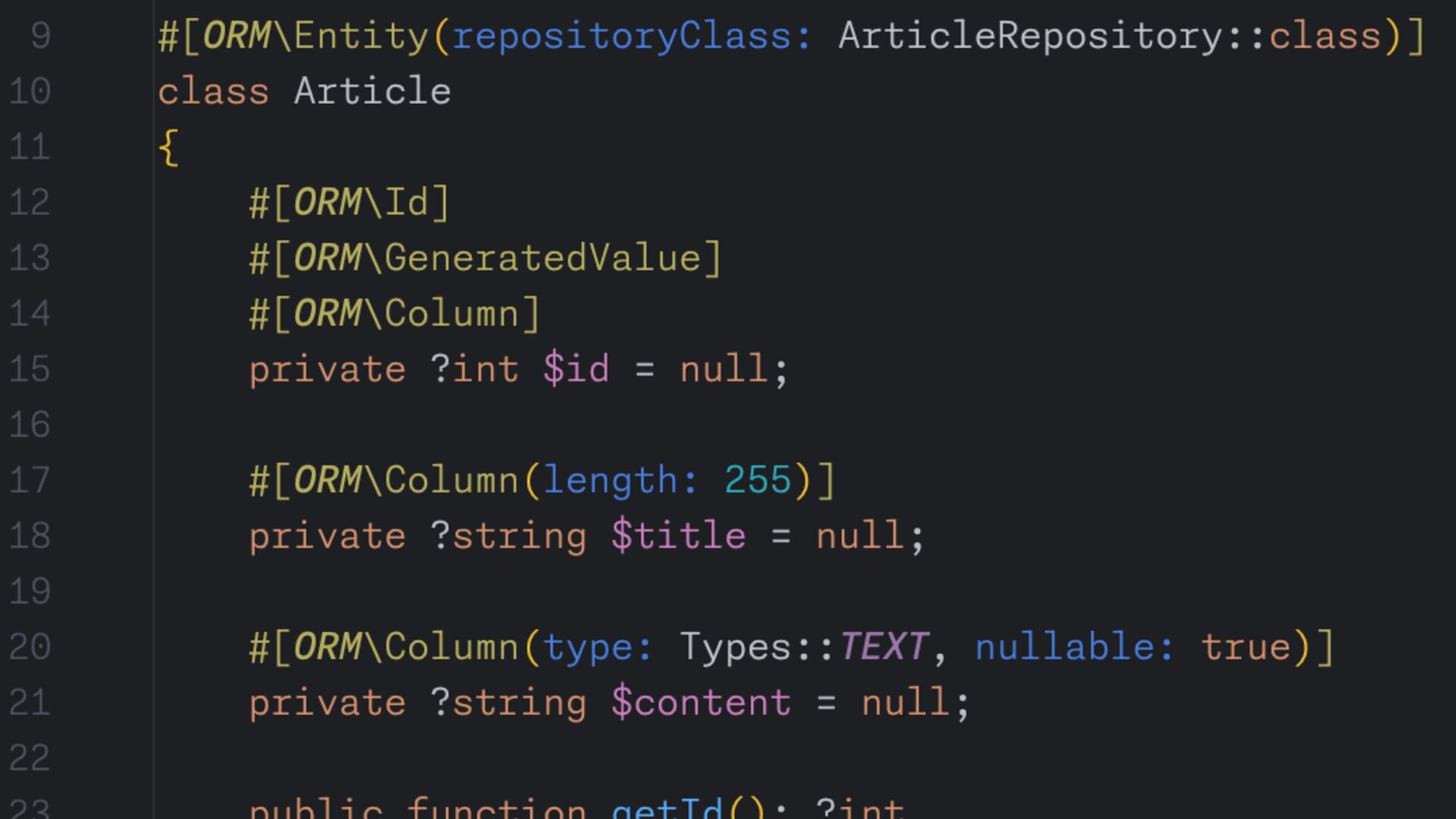 as ORM; #[ORM\Entity] class Article { #[ORM\Id] #[ORM\GeneratedValue] #[ORM\Column(type: Types::INTEGER)] public ?int $id = null; #[ORM\Column(type: Types::STRING, length: 255)] public ?string $title = null; #[ORM\Column(type: Types::TEXT, nullable: true)] public ?string $content = null; } PHP PHP