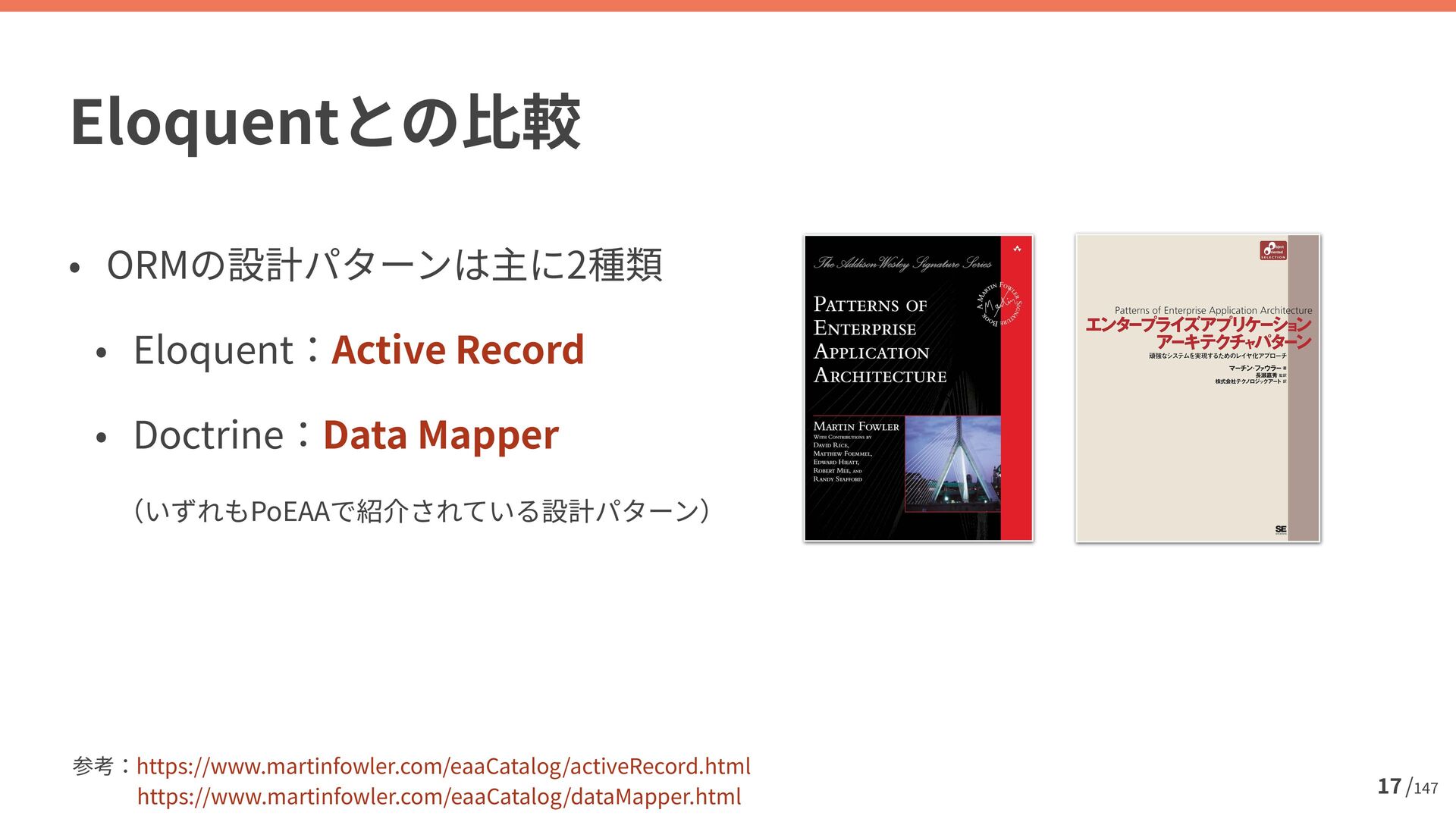 PoEAA Eloquent 比  17 https://www.martinfowler.com/eaaCatalog/activeRecord.html https://www.martinfowler.com/eaaCatalog/dataMapper.html