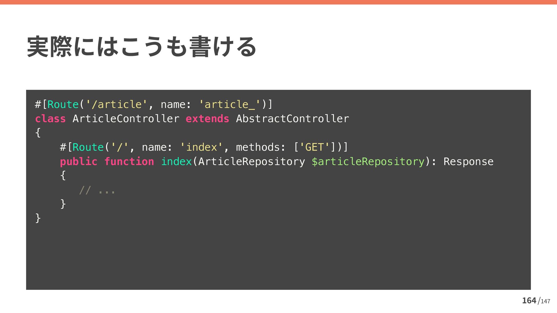 #[Route('/', name: 'index', methods: ['GET'])] public function index(ArticleRepository $articleRepository): Response { // ... } }  164