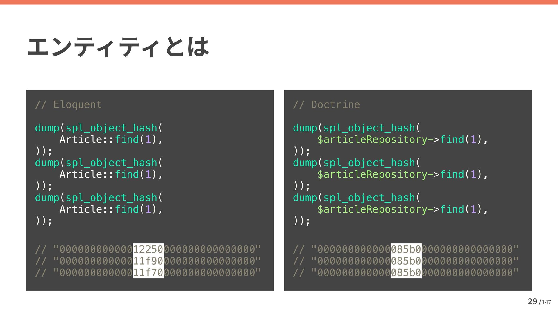 8. / 147 // Eloquent dump(spl_object_hash( Article::find(1), )); dump(spl_object_hash( Article::find(1), ));
