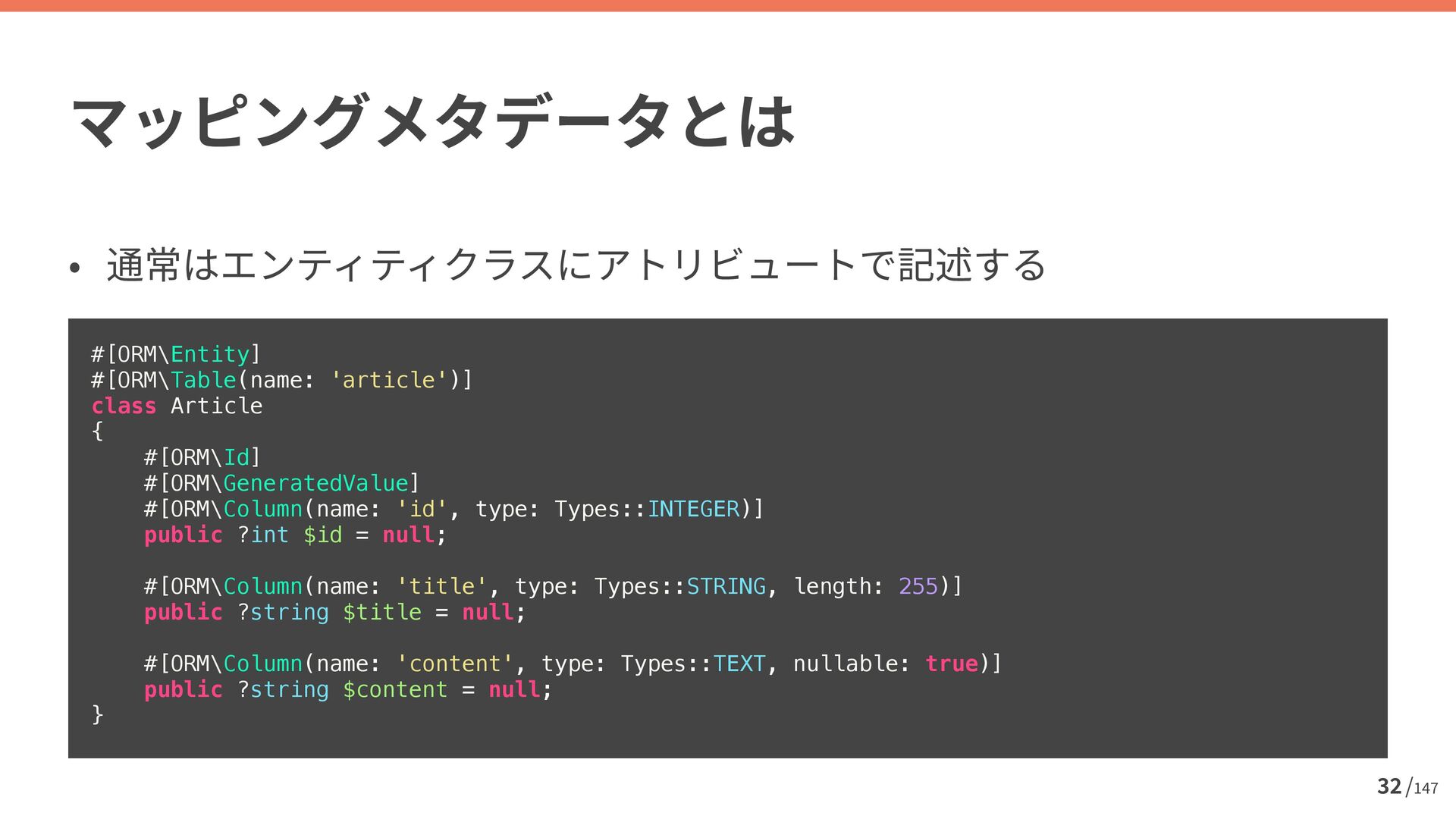 9. / 147  32 #[ORM\Entity] #[ORM\Table(name: 'article')] class Article {