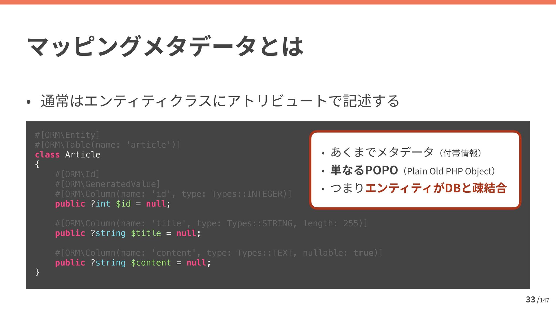 33. / 147 // ΤϯςΟςΟϚωʔδϟʔ͔Β // ArticleΤϯςΟςΟ༻ͷϦϙδτϦΛऔಘ $articleRepository = $entityManager->getRepository(Article::class); //