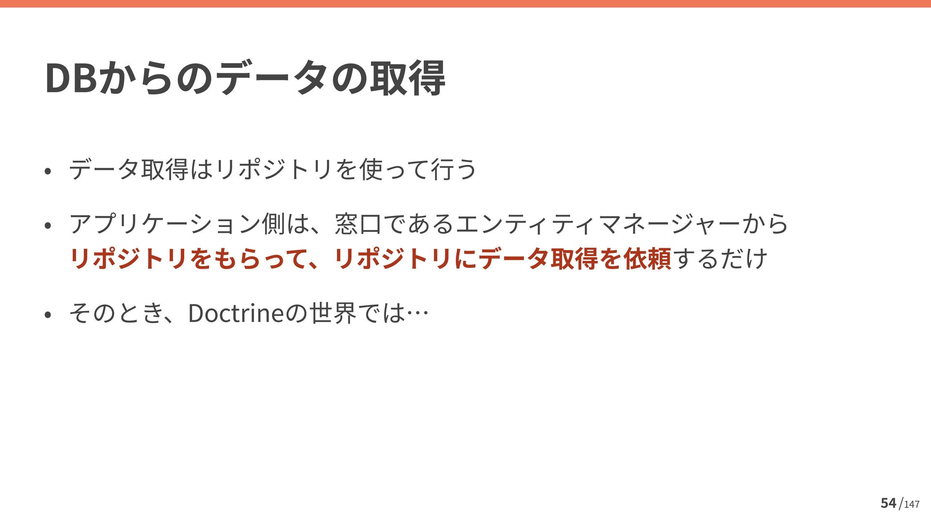 54. / 147 // લఏͱͯ͠ϦϙδτϦ͔ΒΤϯςΟςΟΛऔಘ $article = $articleRepository->find(1); // ͦͯ͠... //