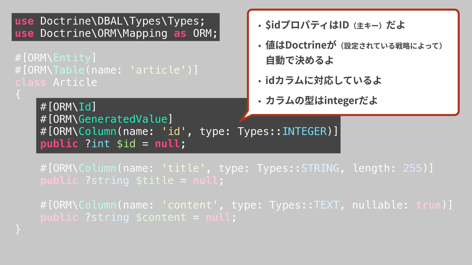 as ORM; #[ORM\Entity] #[ORM\Table(name: 'article')] class Article { #[ORM\Id] #[ORM\GeneratedValue] #[ORM\Column(name: 'id', type: Types::INTEGER)] public ?int $id = null; #[ORM\Column(name: 'title', type: Types::STRING, length: 255)] public ?string $title = null; #[ORM\Column(name: 'content', type: Types::TEXT, nullable: true)] public ?string $content = null; } $id ID Doctrine 自 id integer