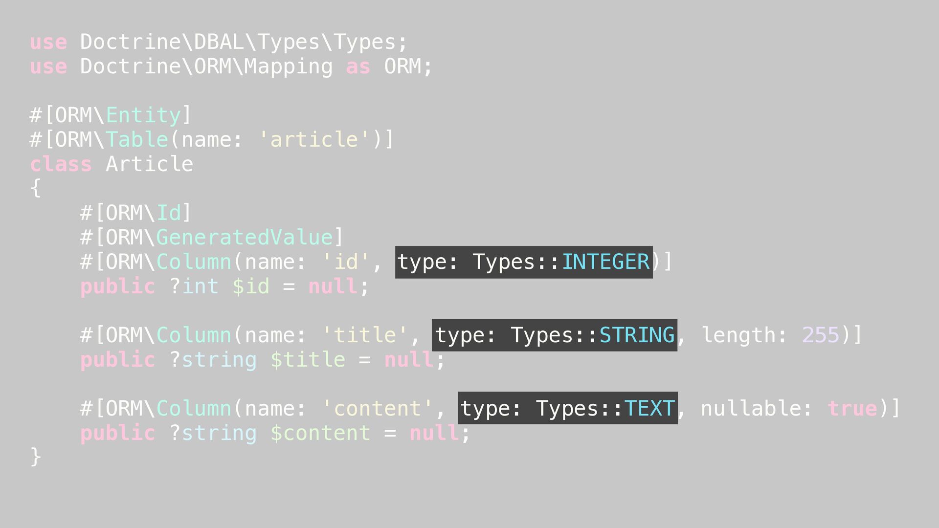 as ORM; #[ORM\Entity] #[ORM\Table(name: 'article')] class Article { #[ORM\Id] #[ORM\GeneratedValue] #[ORM\Column(name: 'id', type: Types::INTEGER)] public ?int $id = null; #[ORM\Column(name: 'title', type: Types::STRING, length: 255)] public ?string $title = null; #[ORM\Column(name: 'content', type: Types::TEXT, nullable: true)] public ?string $content = null; } string integer text