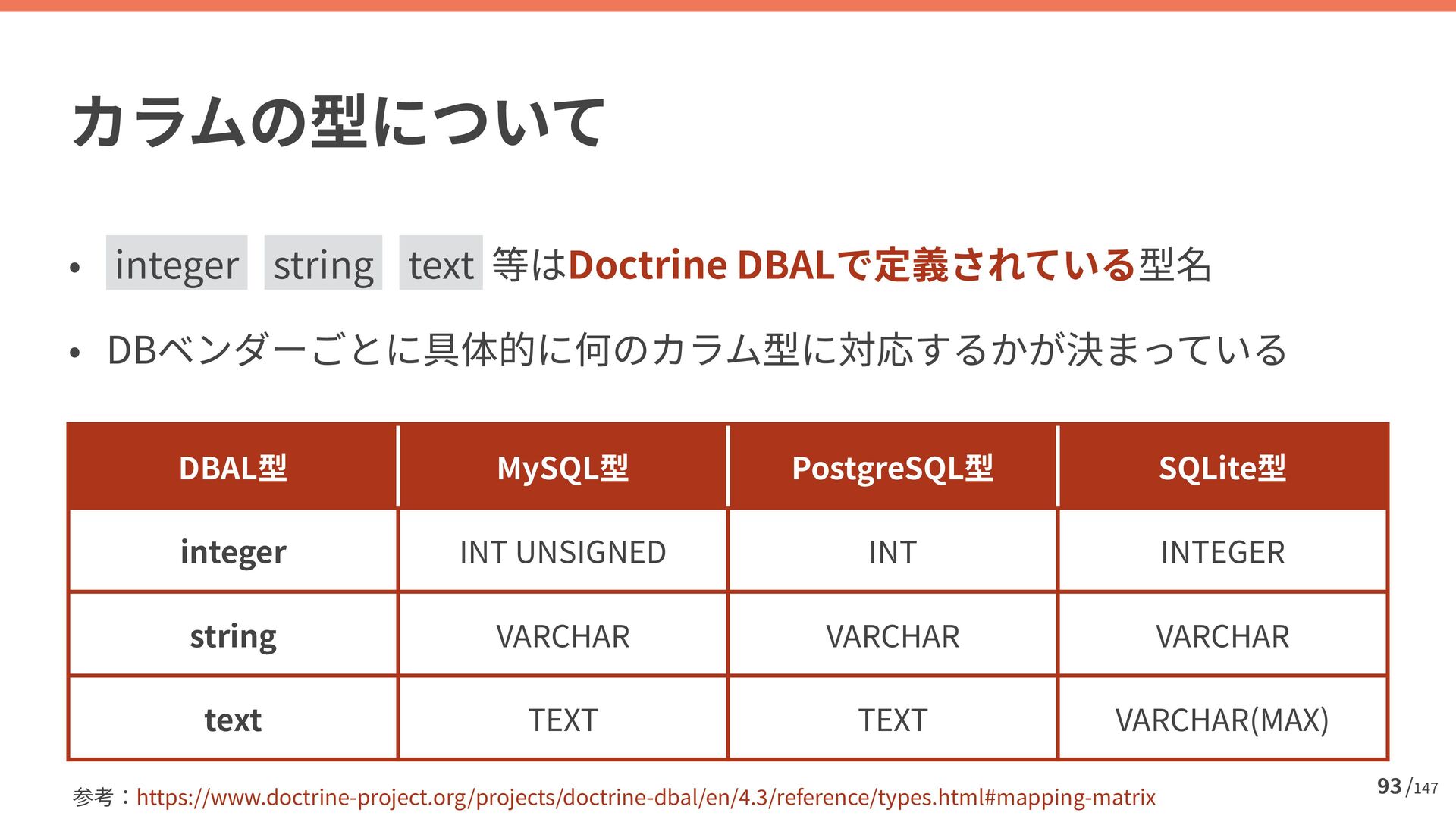 DBAL MySQL PostgreSQL SQLite integer INT UNSIGNED INT INTEGER string VARCHAR VARCHAR VARCHAR text TEXT TEXT VARCHAR(MAX) https://www.doctrine-project.org/projects/doctrine-dbal/en/ 4 . 3 /reference/types.html#mapping-matrix