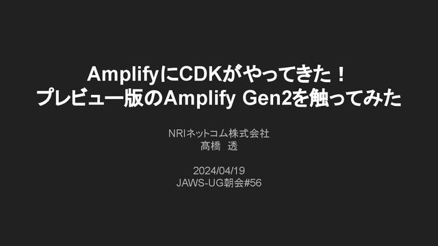 AmplifyにCDKがやってきた! プレビュー版のAmplify Gen2を触ってみた NRIネットコム株式会社 髙橋 透 2024/04/19 JAWS-UG朝会#56