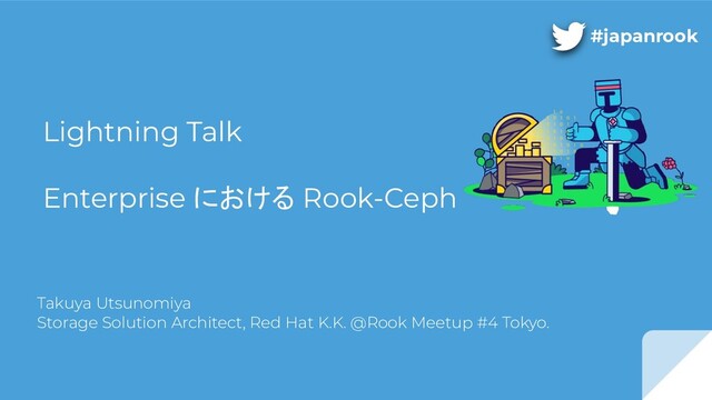 Red Hat K.K. role: ストレージソリューションアーキテクト born: 大阪 version: 38歳 favorites: technology: ストレージ hobby: [“プロレス観戦”,“将棋観戦”,”野球観戦”] drink: [“ビール”, “ワイン”] annoyance: [“尿酸値”, ”最近目が霞む”, “肩が痛い”] うつぼ@[ 〒]Sirsir @japan_rook Japan Rook https://rook.connpass.com/ #japanrook