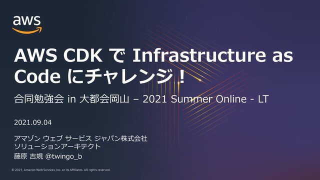 rights reserved. アマゾン ウェブ サービス ジャパン株式会社 ソリューションアーキテクト 藤原 吉規 @twingo_b AWS CDK で Infrastructure as Code にチャレンジ︕ 合同勉強会 in ⼤都会岡⼭ – 2021 Summer Online - LT 2021.09.04