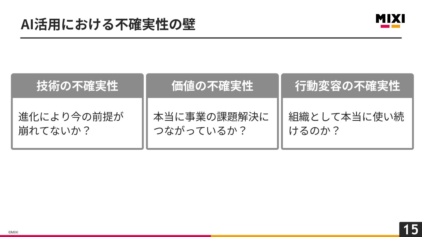 15 ©MIXI AI活⽤における不確実性の壁 進化により今の前提が 崩れてないか? 技術の不確実性 本当に事業の課題解決に つながっているか? 価値の不確実性 組織として本当に使い続