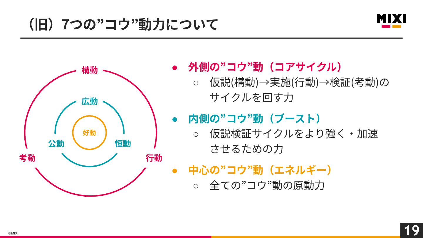18 ©MIXI 7つの”コウ”動⼒について • 外側の”コウ”動(フィードバックループ) ◦ 仮説(構動)→実施(⾏動)→検証(考動)の サイクルを回す⼒ • 内側の”コウ”動(アクセラレーター)