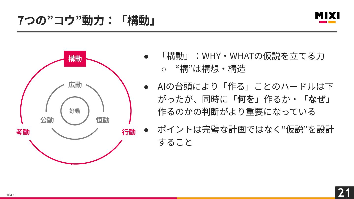 20 ©MIXI 7つの”コウ”動⼒について • 外側の”コウ”動(フィードバックループ) ◦ 仮説(構動)→実施(⾏動)→検証(考動)の サイクルを回す⼒ • 内側の”コウ”動(アクセラレーター)