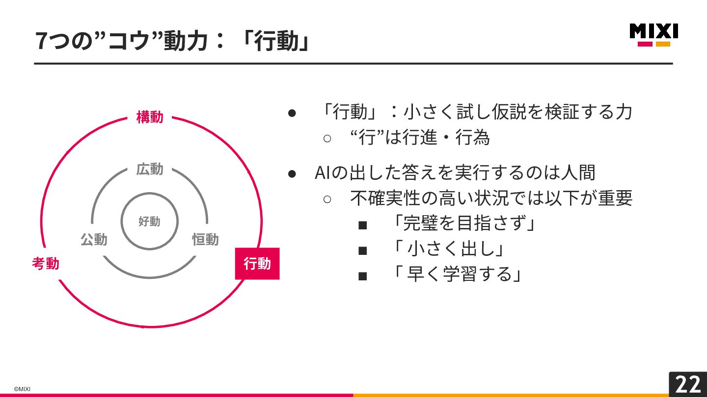 22 ©MIXI • 「⾏動」:⼩さく試し仮説を検証する⼒ ◦ “⾏”は⾏進‧⾏為 • AIの出した答えを実⾏するのは⼈間 ◦ 不確実性の⾼い状況では以下が重要