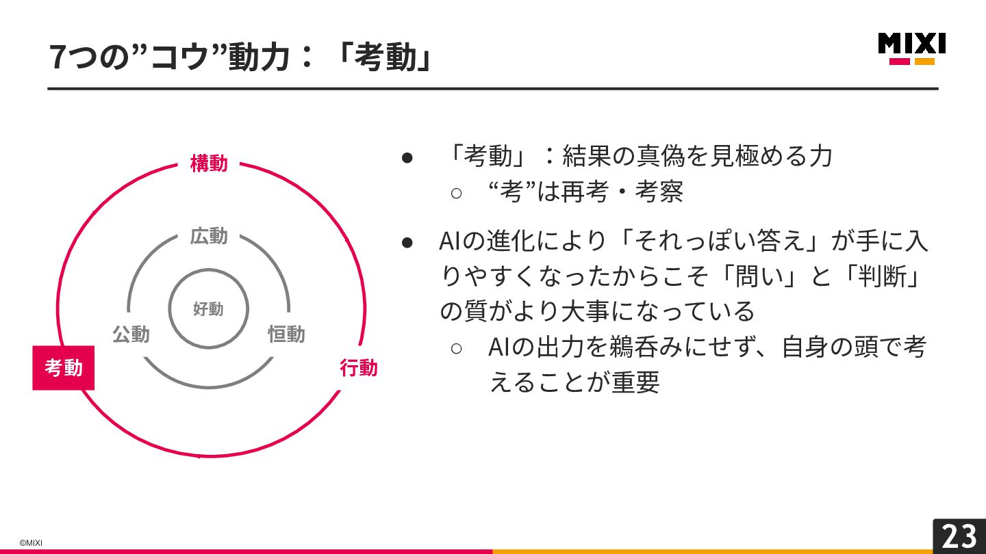 23 ©MIXI • 「考動」:結果の真偽を⾒極める⼒ ◦ “考”は再考‧考察 • AIの進化により「それっぽい答え」が⼿に⼊ りやすくなったからこそ「問い」と「判断」 の質がより⼤事になっている