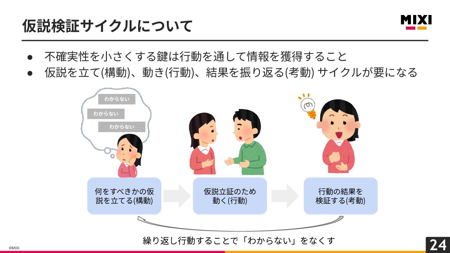24 ©MIXI • 不確実性を⼩さくする鍵は⾏動を通して情報を獲得すること • 仮説を⽴て(構動)、動き(⾏動)、結果を振り返る(考動) サイクルが要になる 仮説検証サイクルについて わからない わからない