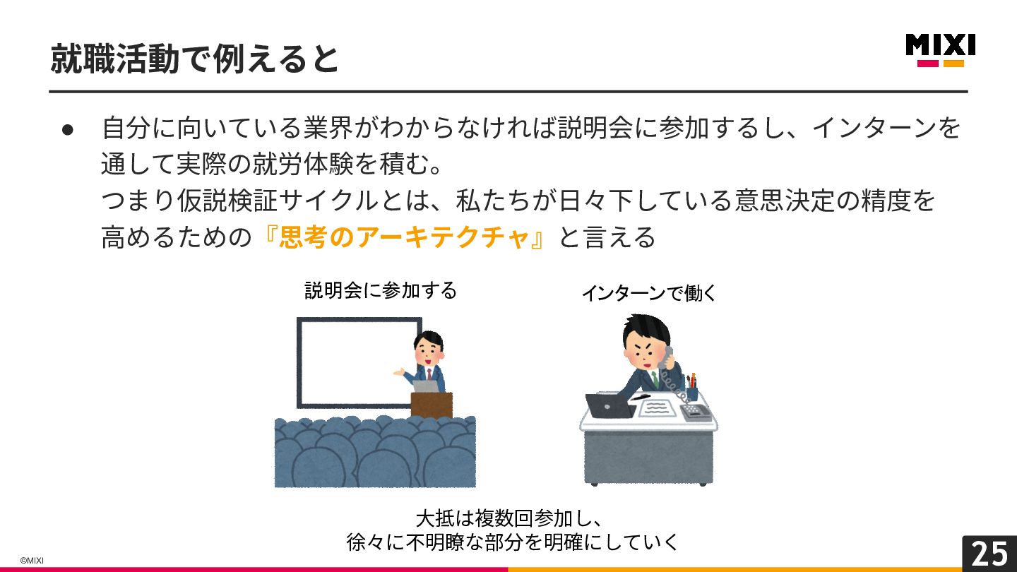 25 ©MIXI • ⾃分に向いている業界がわからなければ説明会に参加するし、インターンを 通して実際の就労体験を積む。 つまり仮説検証サイクルとは、私たちが⽇々下している意思決定の精度を ⾼めるための『思考のアーキテクチャ』と⾔える 就職活動で例えると 説明会に参加する インターンで働く