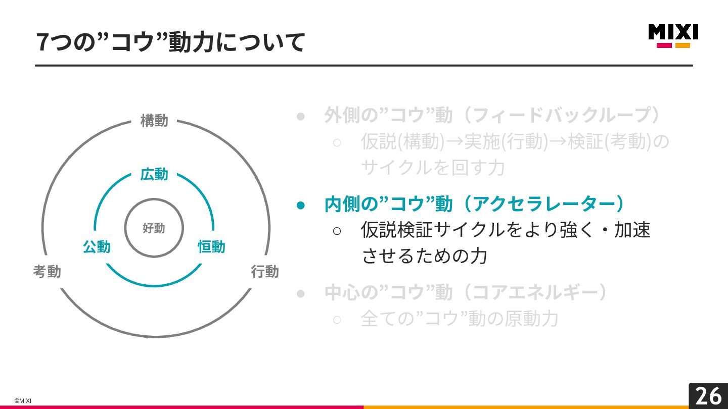 26 ©MIXI 7つの”コウ”動⼒について • 外側の”コウ”動(フィードバックループ) ◦ 仮説(構動)→実施(⾏動)→検証(考動)の サイクルを回す⼒ • 内側の”コウ”動(アクセラレーター)