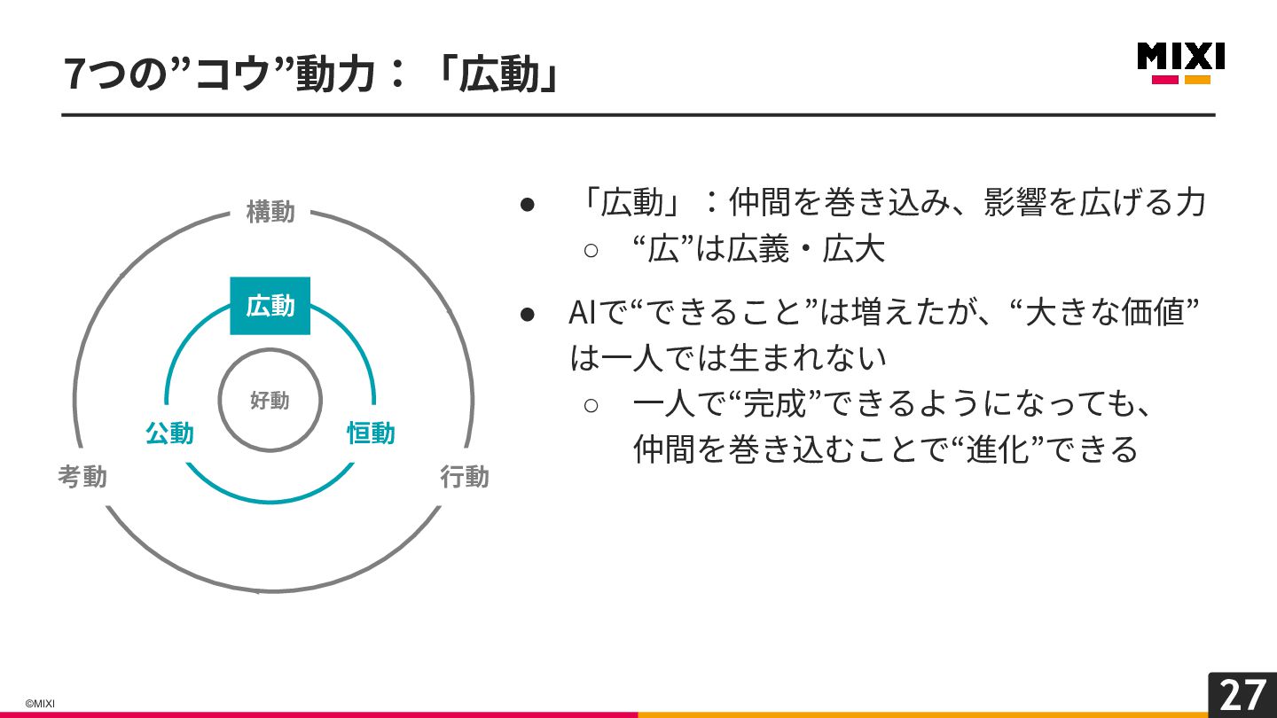 27 ©MIXI 7つの”コウ”動⼒:「広動」 • 「広動」:仲間を巻き込み、影響を広げる⼒ ◦ “広”は広義‧広⼤ • AIで“できること”は増えたが、“⼤きな価値” は⼀⼈では⽣まれない