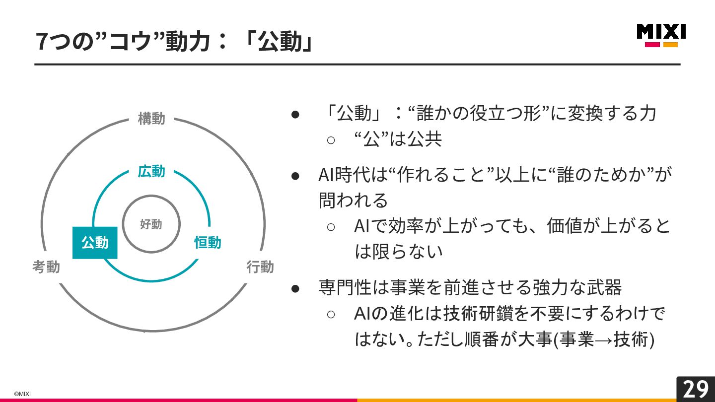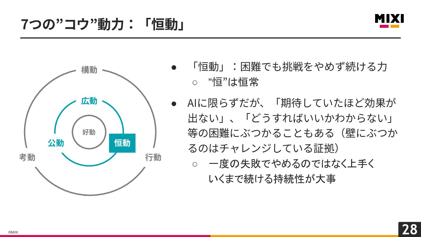 28 ©MIXI 7つの”コウ”動⼒:「恒動」 • 「恒動」:困難でも挑戦をやめず続ける⼒ ◦ “恒”は恒常 • AIに限らずだが、「期待していたほど効果が 出ない」、「どうすればいいかわからない」