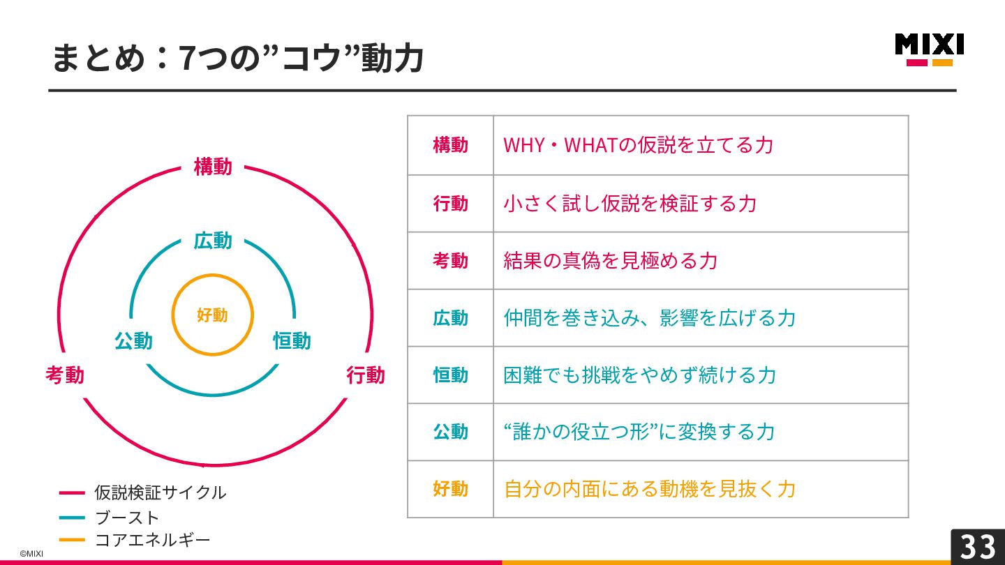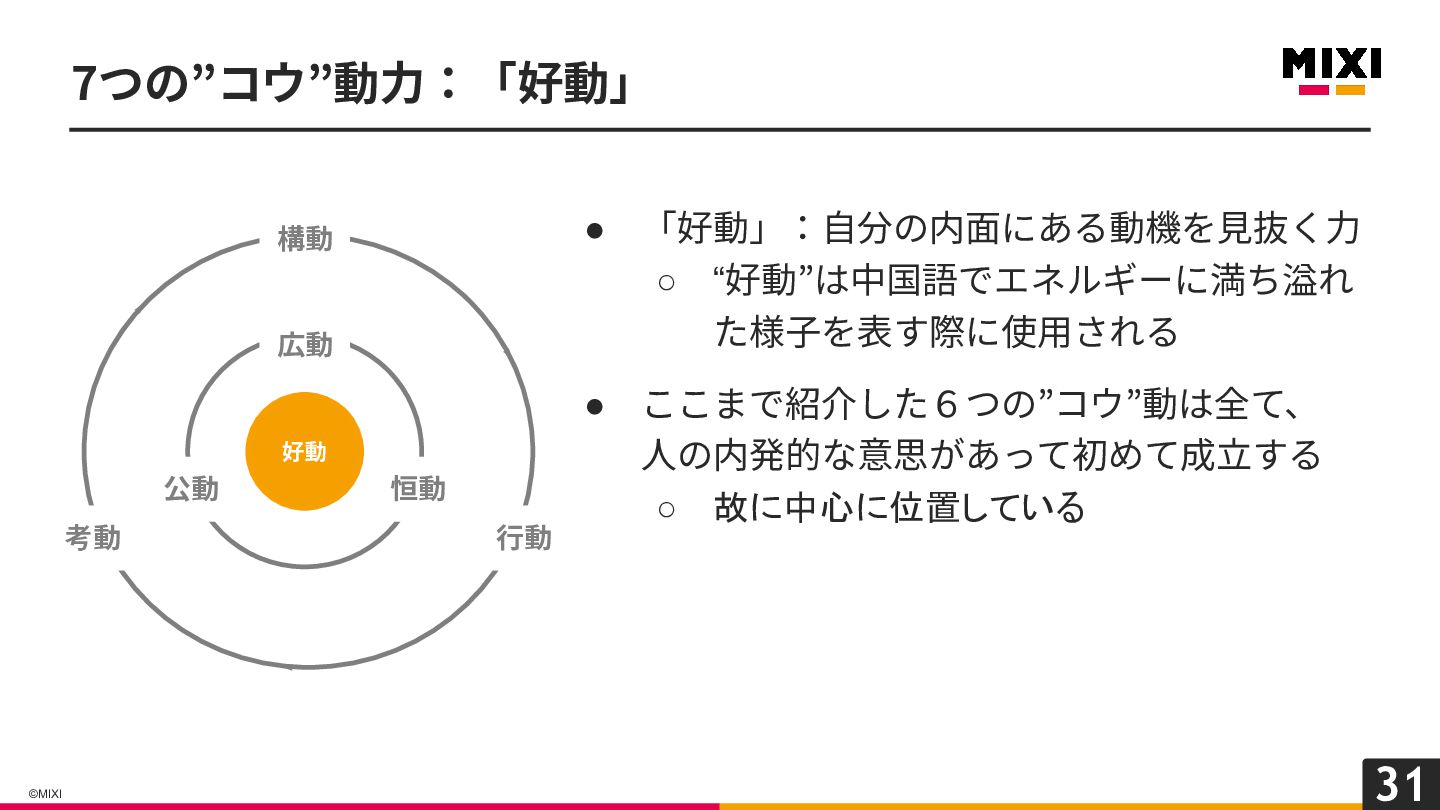 30 ©MIXI 7つの”コウ”動⼒について • 外側の”コウ”動(フィードバックループ) ◦ 仮説(構動)→実施(⾏動)→検証(考動)の サイクルを回す⼒ • 内側の”コウ”動(アクセラレーター)