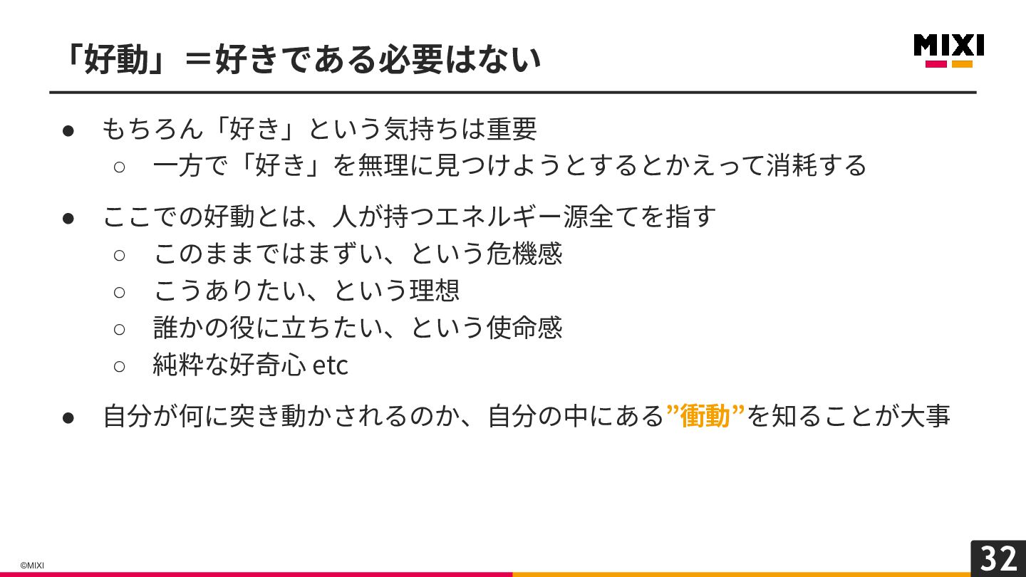 32 ©MIXI • もちろん「好き」という気持ちは重要 ◦ ⼀⽅で「好き」を無理に⾒つけようとするとかえって消耗する • ここでの好動とは、⼈が持つエネルギー源全てを指す ◦ このままではまずい、という危機感