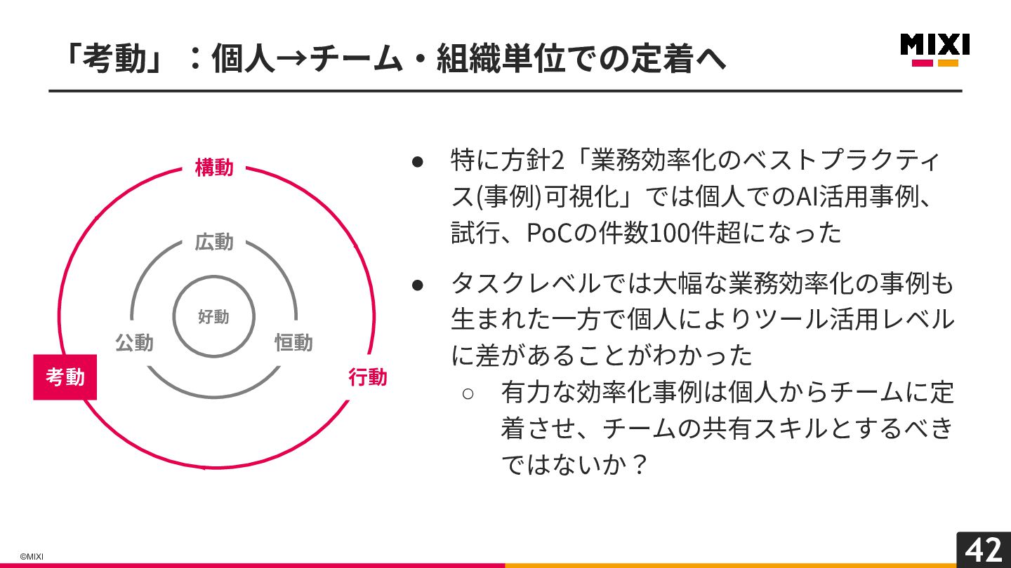 42 ©MIXI • 特に⽅針2「業務効率化のベストプラクティ ス(事例)可視化」では個⼈でのAI活⽤事例、 試⾏、PoCの件数100件超になった • タスクレベルでは⼤幅な業務効率化の事例も ⽣まれた⼀⽅で個⼈によりツール活⽤レベル に差があることがわかった