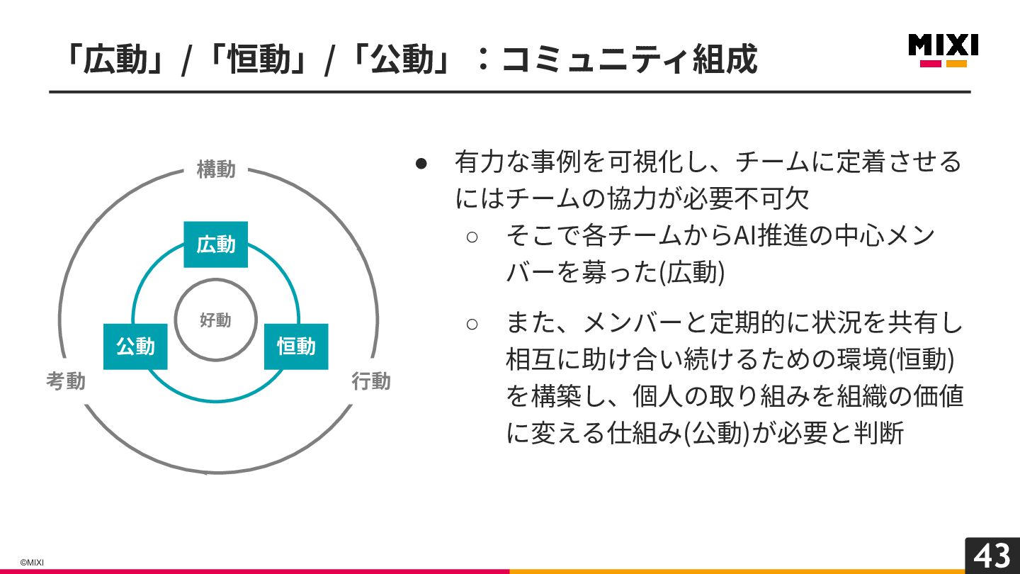 43 ©MIXI • 有⼒な事例を可視化し、チームに定着させる にはチームの協⼒が必要不可⽋ ◦ そこで各チームからAI推進の中⼼メン バーを募った(広動) ◦ また、メンバーと定期的に状況を共有し